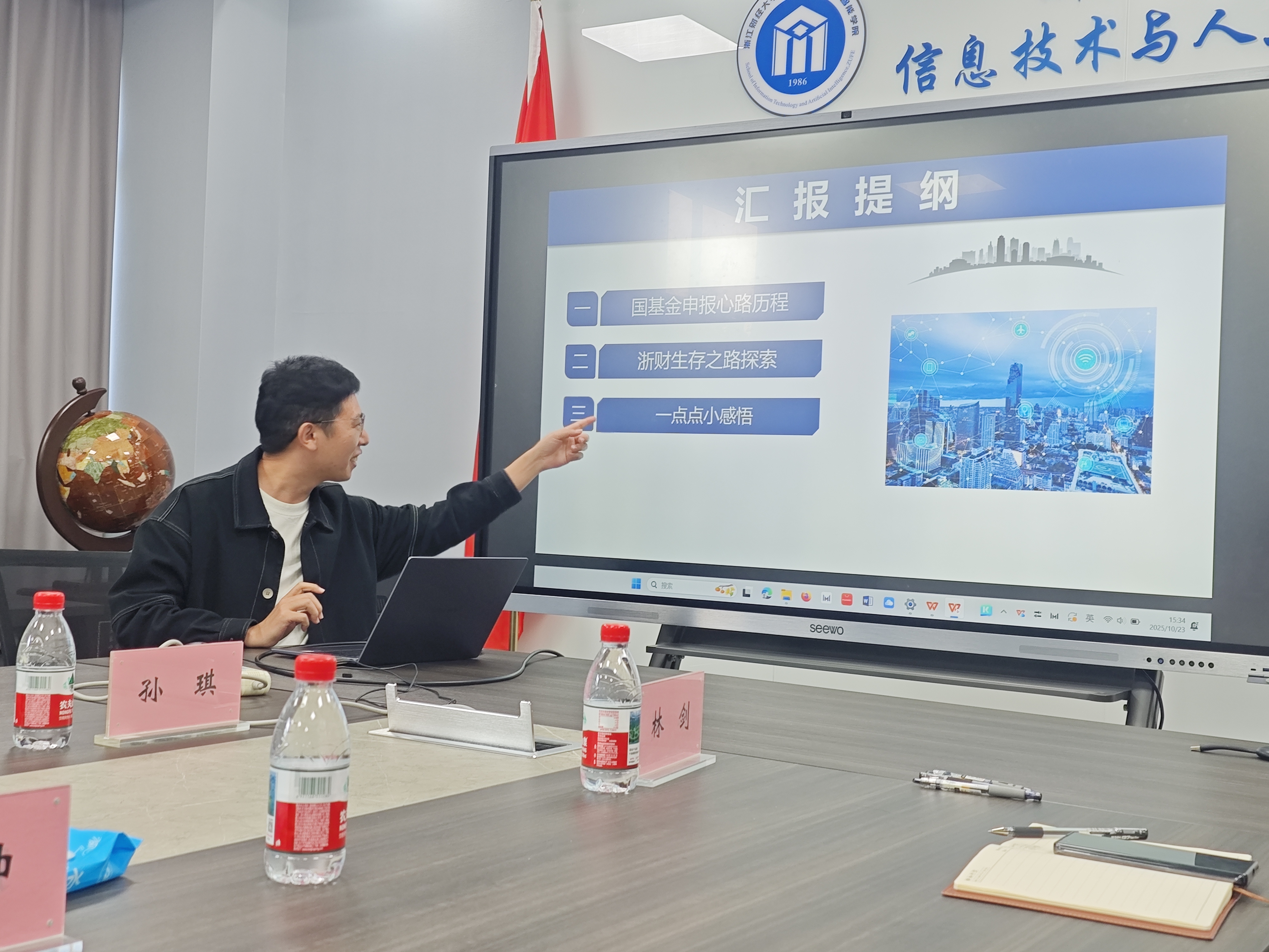 教师作国家级科研项目申报经验分享,会议由学院科研院长林剑教授主持,学院申报国家课题的教师参会。