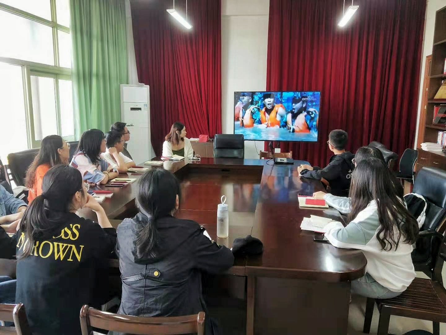 最后,学生第四党支部全体成员集体观看文献专题纪录片《我们走在大路上》。
