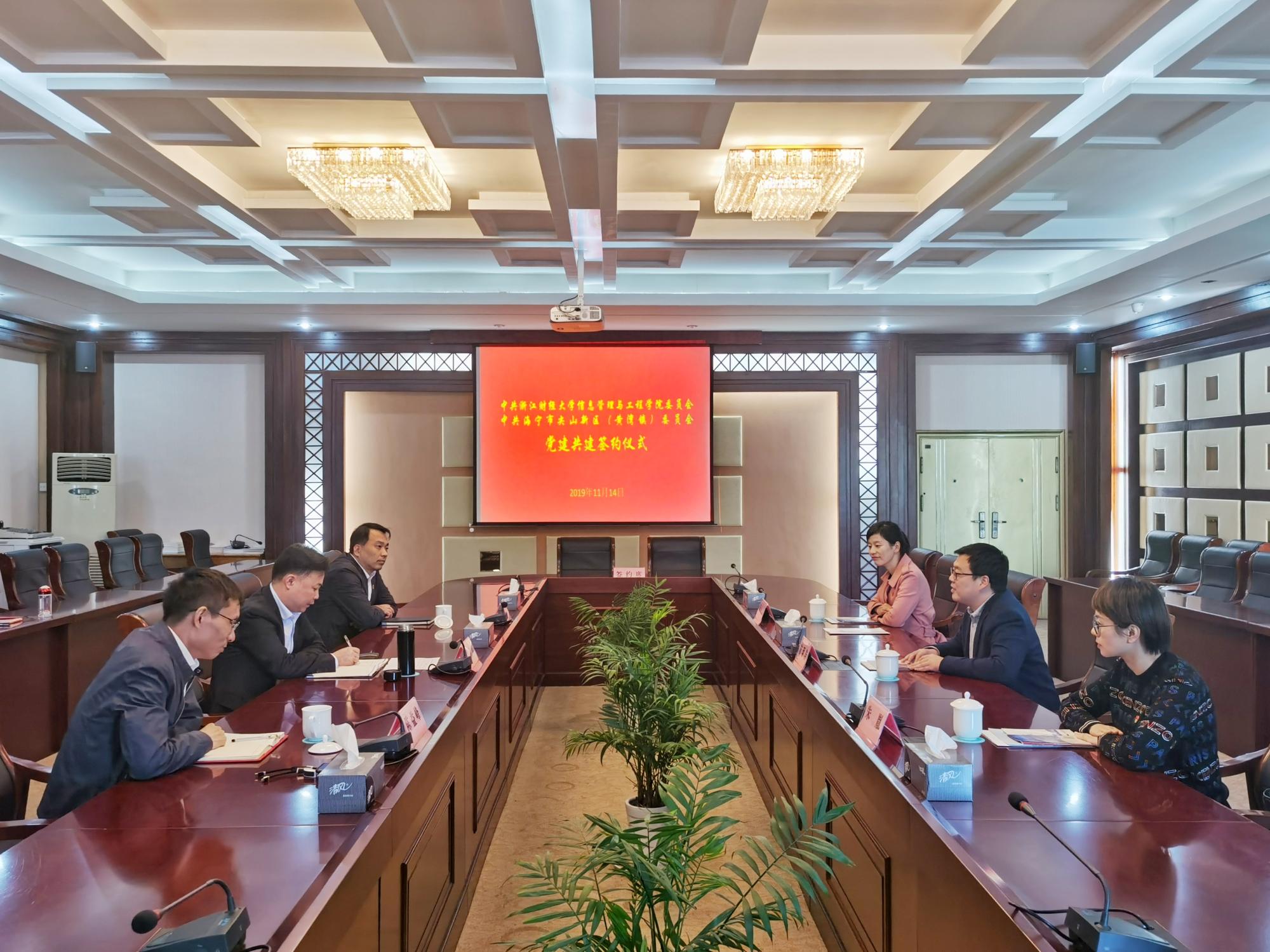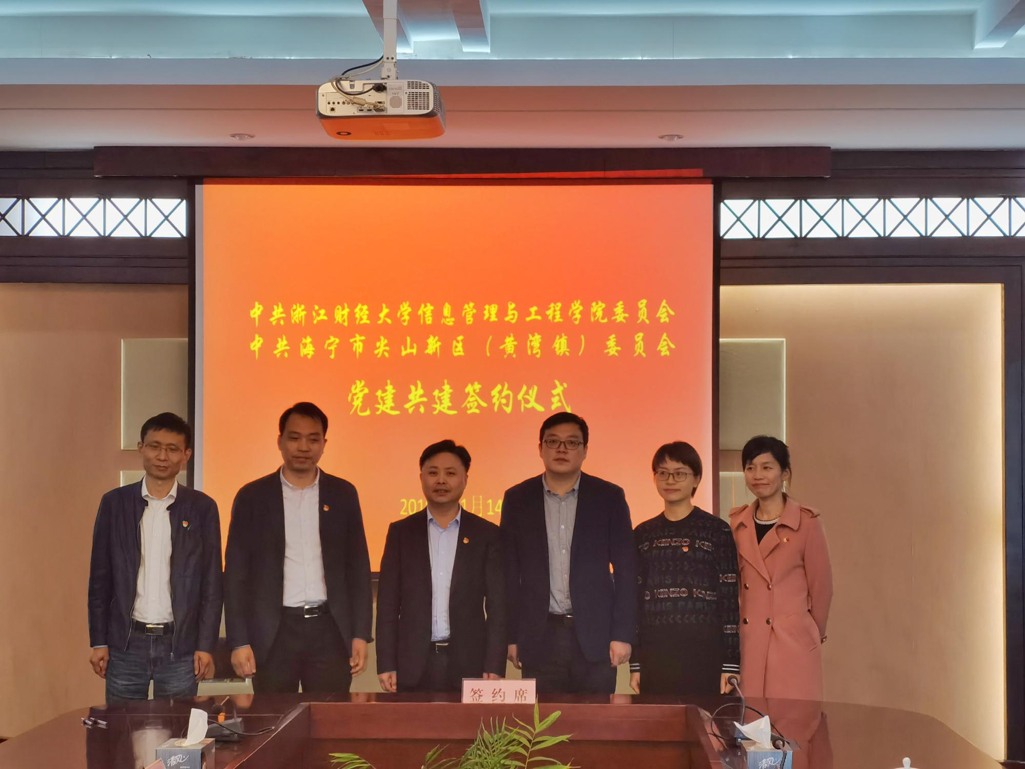 为深入学习贯彻习近平新时代中国特色社会主义思想和党的十九大精神,扎实推进“不忘初心、牢记使命”主题教育,信工学院党委与海宁市尖山新区(黄湾镇)党委举行党建共建签约仪式。海宁市尖山新区(黄湾镇)党委书记董国平、信工学院党委副书记陆颋浩、行政办主任朱胤、学工办主任陈小芳等出席签约仪式。