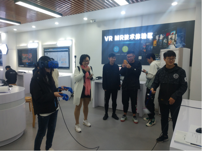 章华和姜海银老师与志愿者向来访的师生介绍了人工智能体验园的相关设备,并一同体验了人脸融合、图形风格迁移、VR、自动驾驶模拟系统、六轴机械臂、人机对弈机器人等多个项目。