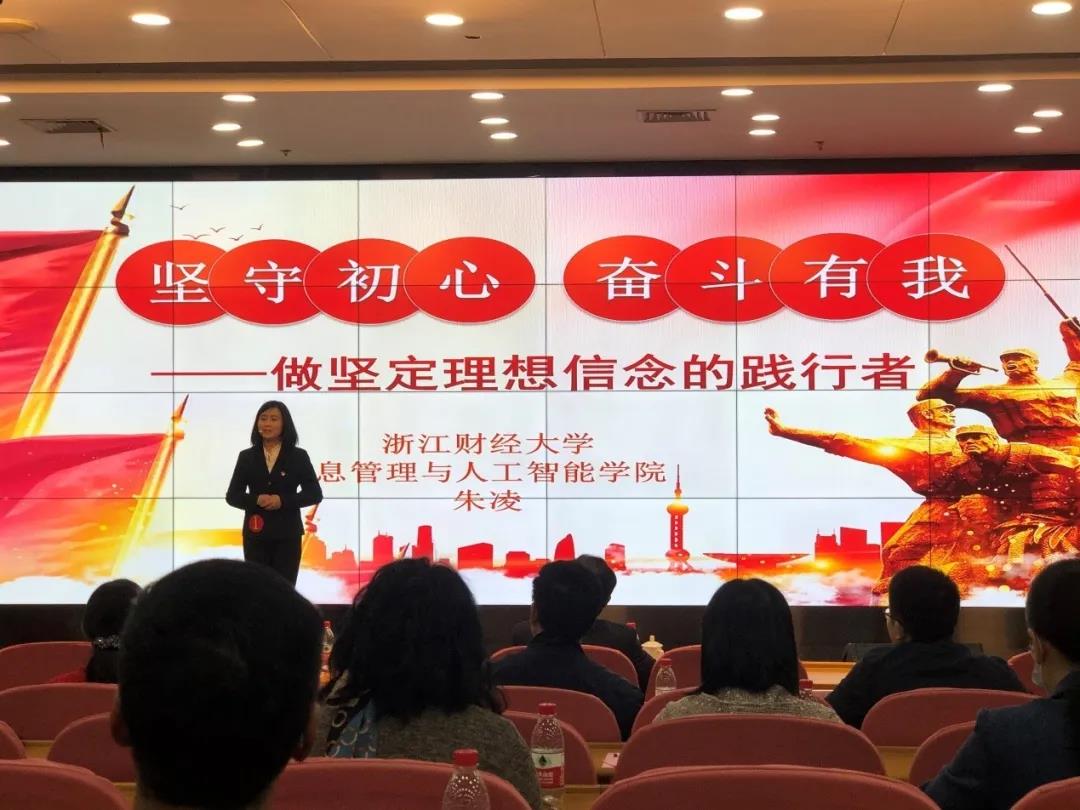 党员教师朱凌以《坚守初心奋斗有我——做坚定理想信念的践行者》为题进行了微党课展示。在微党课中,她通过“研”“学”“教”三个方面,向我们介绍了一群迎难而上,不畏险阻,为放飞“中国梦”而奋斗的浙财青年党员。这些平凡青年党员的奉献与担当,正是实现如今中国日益强大的关键所在。而作为党员教师的她,始终牢记党员身份,坚守立德树人的初心使命,教书育人,为脱贫攻坚、决胜小康贡献自己的青春力量。