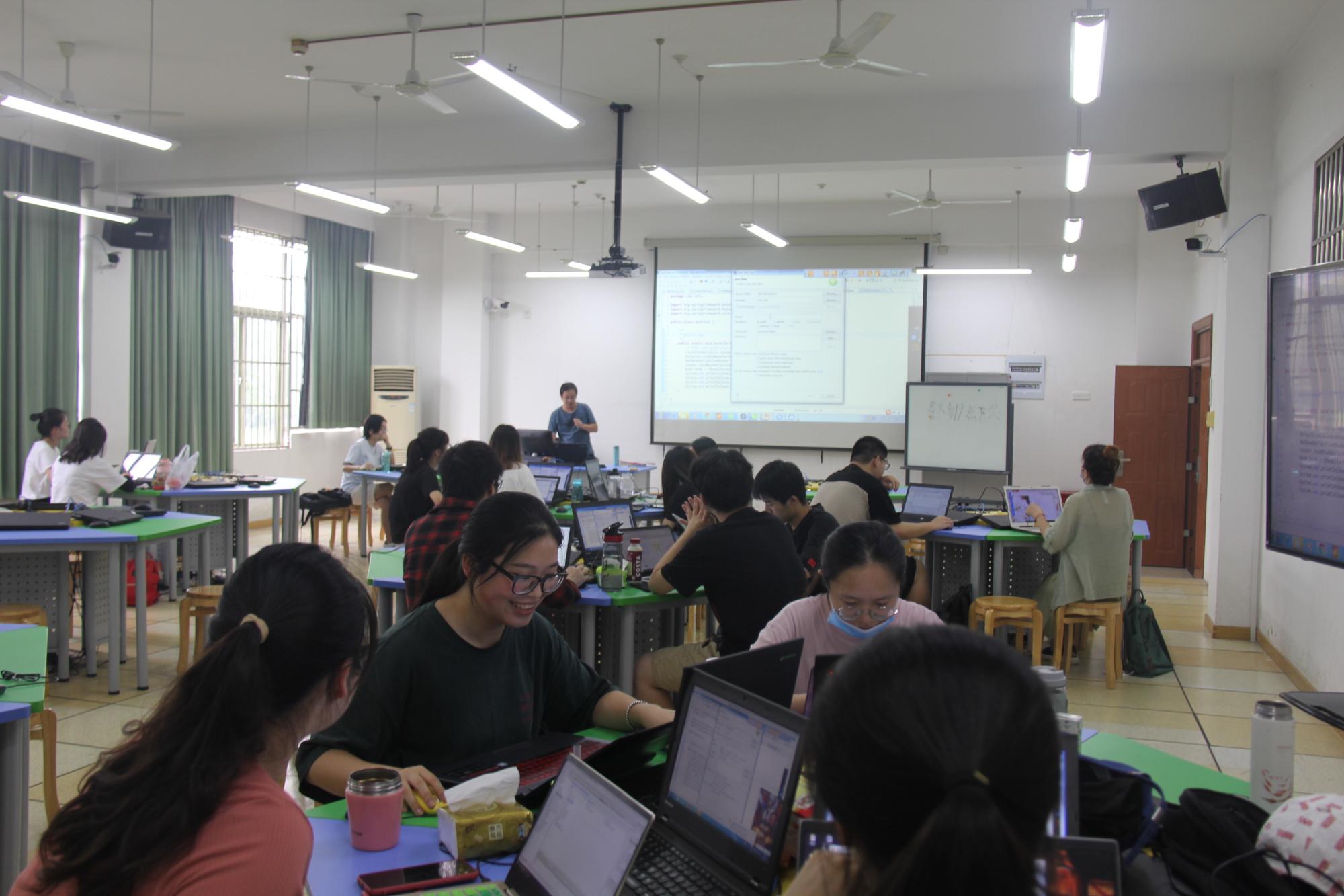 在暑期短学期的两周时间,17、18两个年级共计520名学生全部留校,在各个实验室中,由项目指导老师进行集中辅导与自主动手实践,完成各类项目的实践任务。这些项目中,有学术训练与实践能力提升类的项目,如信息管理中的数据分析与智能决策、互联网搜索技术、数据可视化、企业管理信息化实训沙盘模拟(ERP)、基于CANSLIM模型的股票金融数据量化分析等;也有学科竞赛培训类的项目,如建模分析与决策优化、程序设计竞赛实践、软件服务外包项目实践、电子设计竞赛培训等;还有面向求职的技术技能培训类项目,如H5前端开发技术培训、python机器学习实践、TensorFlow应用实战、互联网企业运营实训等。