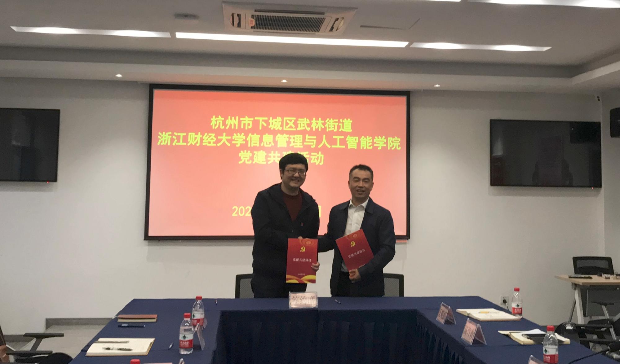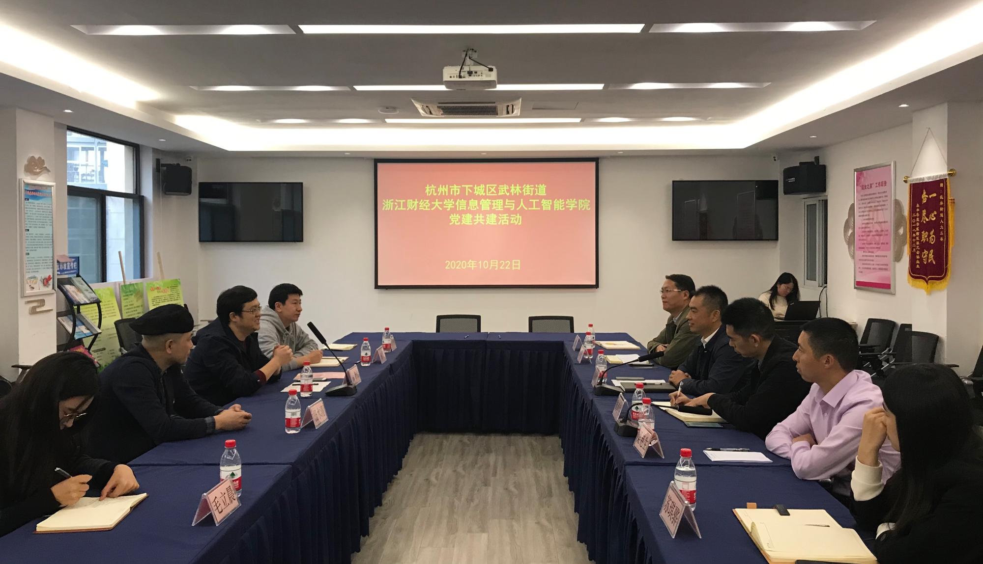 党委书记徐奇伟介绍了学院的基本情况、学科优势和特色党建工作,并希望能在教工和学生两个层面,从社会实践、志愿服务、技术交流、人才合作等多方面加强与武林街道党工委的交流合作。武林街道党工委书记唐国宏介绍了街道党工委如何借助党群服务驿站,在优化“武林店小二”平台服务、疫情复产复工、民生保障服务、智慧养老服务、数字街道综合、武林非遗市集、文化家园建设和基层治理等方面推进党建引领工程。另外,学院与会党员老师还就人才培养、社会服务、宣传和团委等工作与武林街道党工委副书记梅育生,武林街道党建办主任、机关党总支书记梁艳生和武林街道团委副书记苏琪骅展开了交流。