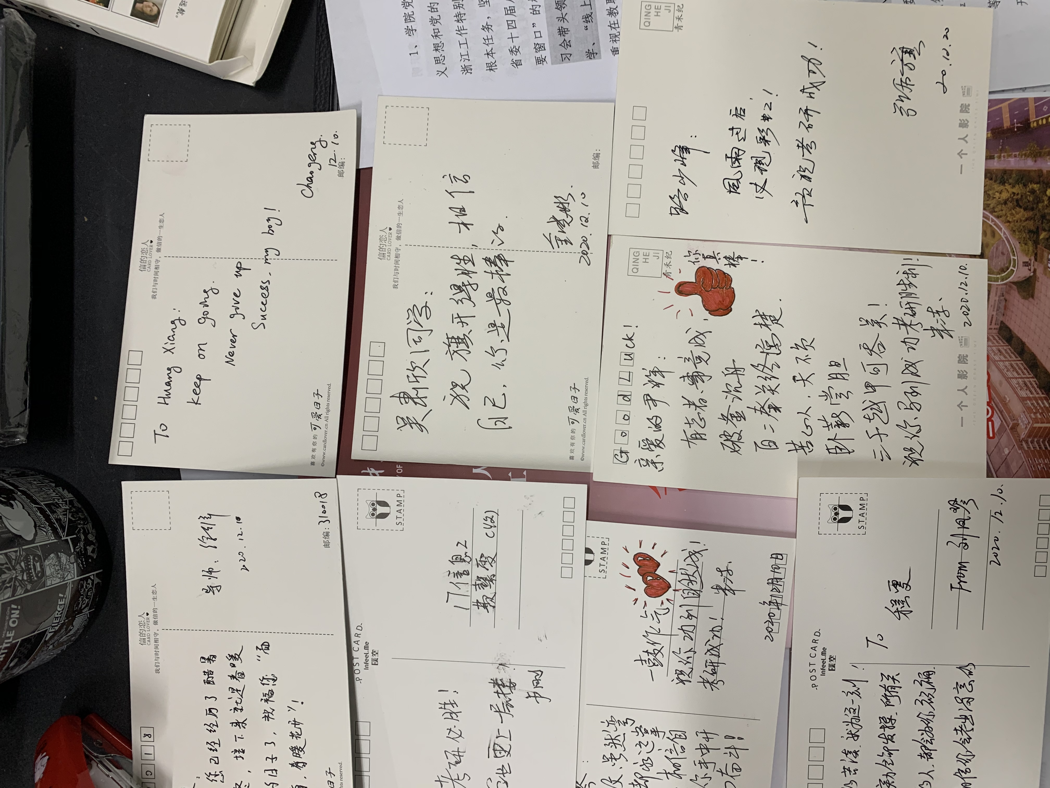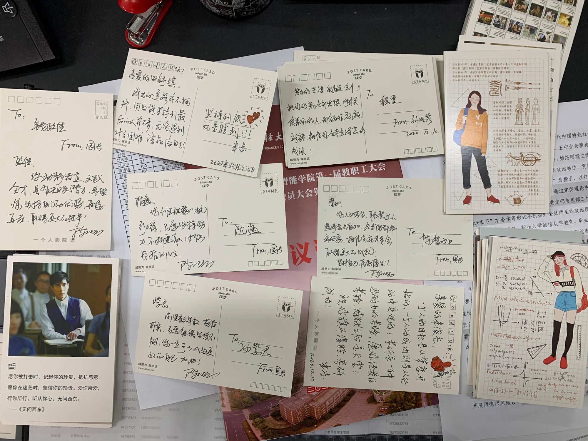 学院分工会给每位教师分发明信片,可以给自己指导的考研学生,也可以对“他、她”送上祝语。教师们认真思考,沉着下笔,写下浓情的一字一句祝福,学院将这些专属明信片一一送至每位同学手中,每张卡片都承载着学院与教师对考研学子的细致关怀和殷切期望。送出冬日里的一份温暖,冲研有伴,同学们加油!