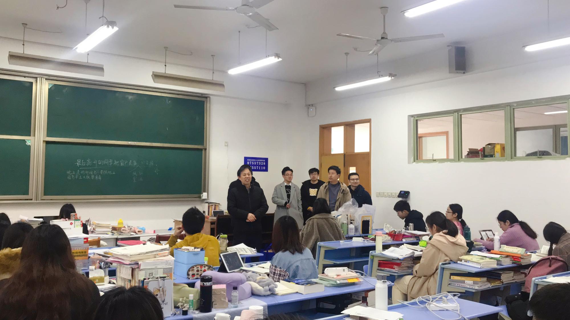院长张帅、院党委书记徐奇伟、副院长陈远高、党委副书记田聪以及学院辅导员一行前往考研教室,为处于冲刺阶段的大四学生送去考研慰问与鼓励。