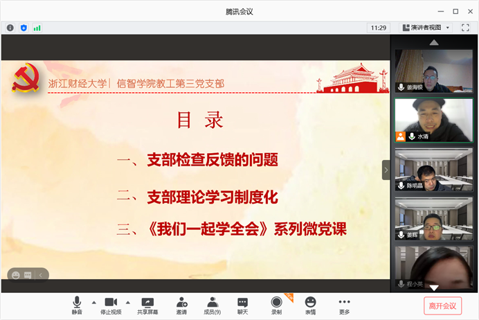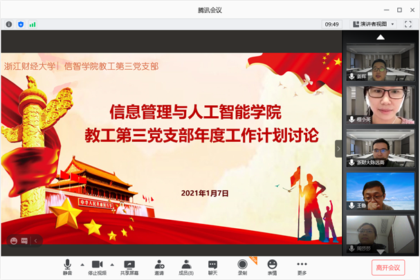 为更好地贯彻落实“三会一课”,学习《我们一起学全会》系列微党课,推进学习教育常态化和制度化,202117日,信息管理与人工智能学院教工第三党支部在线开展支部党员大会,商讨支部2021年度工作计划。