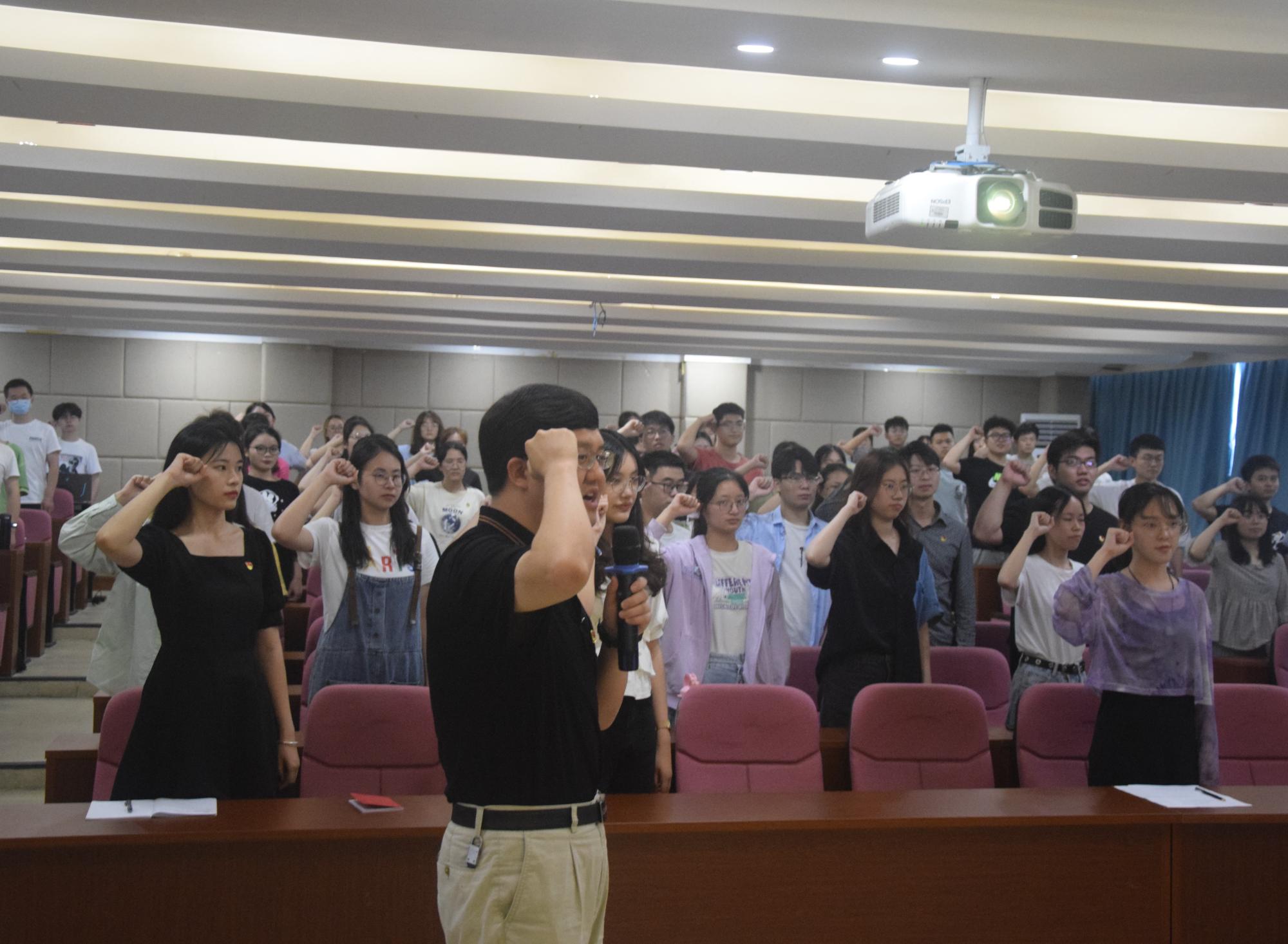 仪式开始,在徐奇伟书记的带领下,在场师生齐唱国歌。预备党员们全体起立,举起右拳庄严宣读入党誓词。面对鲜红的党旗,所有人都发自内心地表达出入党的坚定决心,宣读出自己作为一名党员的初心与使命。