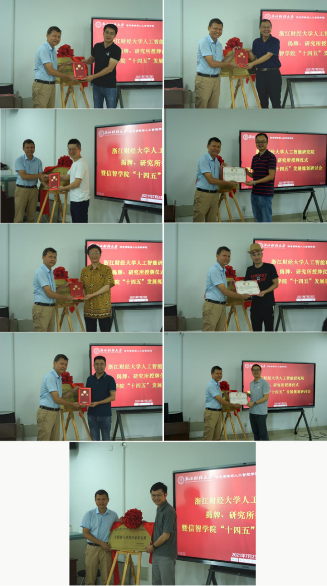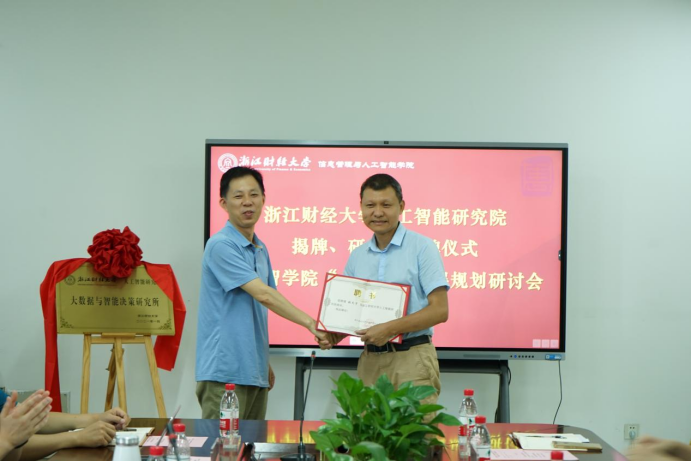 研究院院长张文宇强调,现今时期,数字化改革是全国大势所趋,这样的社会背景为我们提供了大量的机会,我们要及时抓住机遇,走向时代的前沿。接着,张文宇院长为人工智能研究院下设四个研究所授牌,并为各研究所所长、副所长颁发聘书。