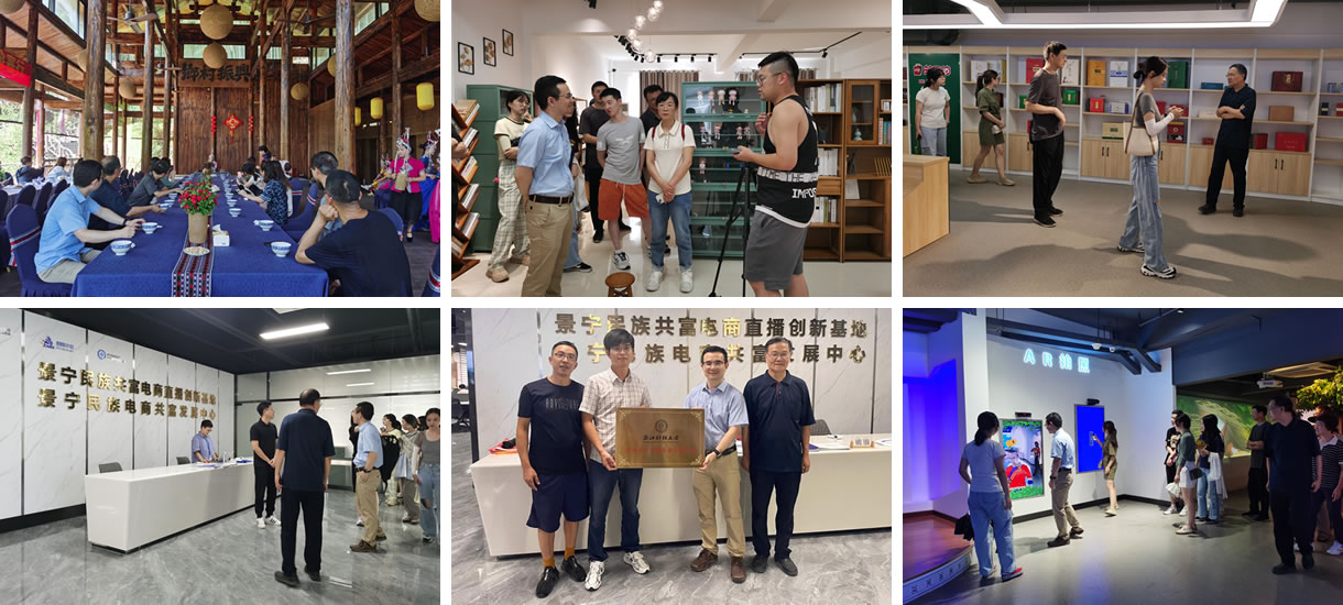 之后,服务团先后考察了景宁县大均乡的“中国畲乡之窗”和鹤溪镇东弄村的畲家田园综合体,在畲族阿妹的带领下感受了独特的少数民族风情,并详细了解了畲乡“农旅+电商+商贸”的运营模式,正是在这种创新的模式之下,乡、村集体经济得到了蓬勃的发展,同时,田园综合体的运营也直接带动了周边农家乐、民宿等产业的发展,创造了景区工作人员、演职人员、讲解员等一批新的就业岗位,解决了村民的就业问题,为村民收入的增收提供了新保障。为进一步了解景宁县整体电商产业的发展,下午服务团还参观了景宁数字文创电子商务产业园,与园区的负责人、入驻企业负责人进行了深入的交流。服务团还来到景宁“600”综合服务中心,参观景宁特色农产品展销中心、畲乡助农直播间和畲乡文创产品展示中心,通过景宁民族电商共富发展中心工作人员的介绍,了解景宁电子商务发展情况,并举行了“哔咔漫画