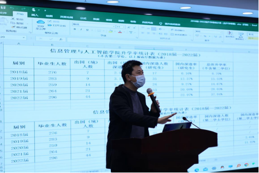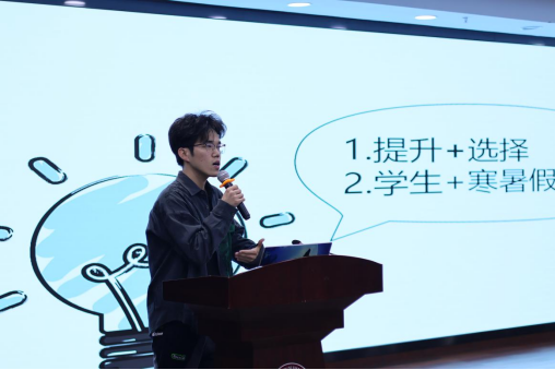 最后,田聪老师进行了升学、就业工作总动员。田老师通过分析学院历年的升学和就业情况,从目标选择、职业发展、简历撰写等方面提出了宝贵建议,同时表达了自己对同学们一战成“硕”、顺利就业的美好期望和衷心祝福。