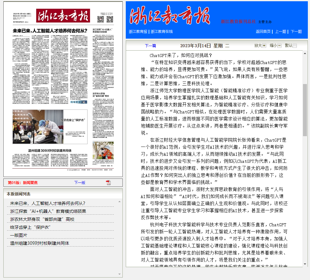 浙江师范大学数理医学院人工智能(智能精准诊疗)专业侧重于医学应用场景,培养学生掌握扎实的数理基础和人工智能有关知识,学习如何基于医学影像大数据开发相关算法,为智能精准诊疗、分级诊疗和健康中国战略助力。“与ChatGPT相似,在处理医学数据时,人们需要大量高质量的人工标准数据,进而根据不同的医学需求设计相应的算法,更加智能地辅助医生开展诊疗。从这点来讲,两者是相通的。”该院副院长黄守军说。