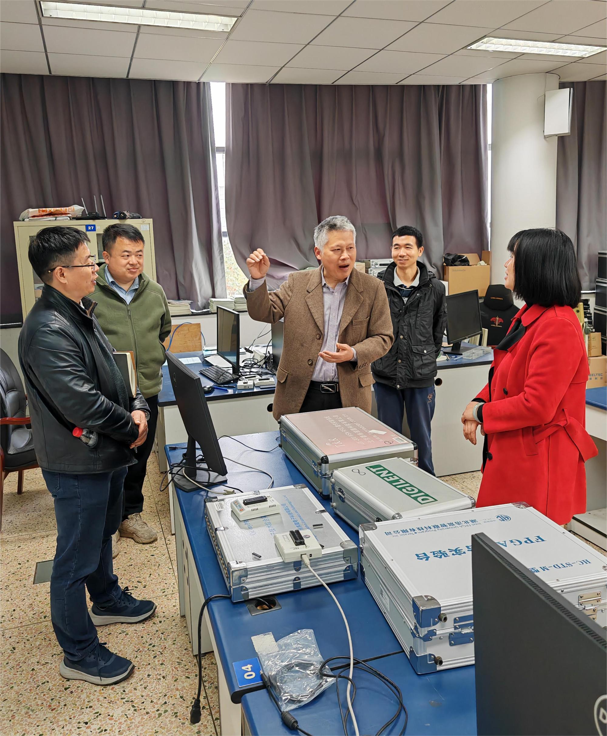 在朱金刚老师带领下,一行人员参观了实验室,了解了数电、模电实验设备和可编程逻辑实验箱、配套仪器仪表、实验内容等。双方就实验室建设、课程内容设计、师资配置等问题做了充分的沟通交流,为今后计算机专业实验室的建设打下了前期的基础。