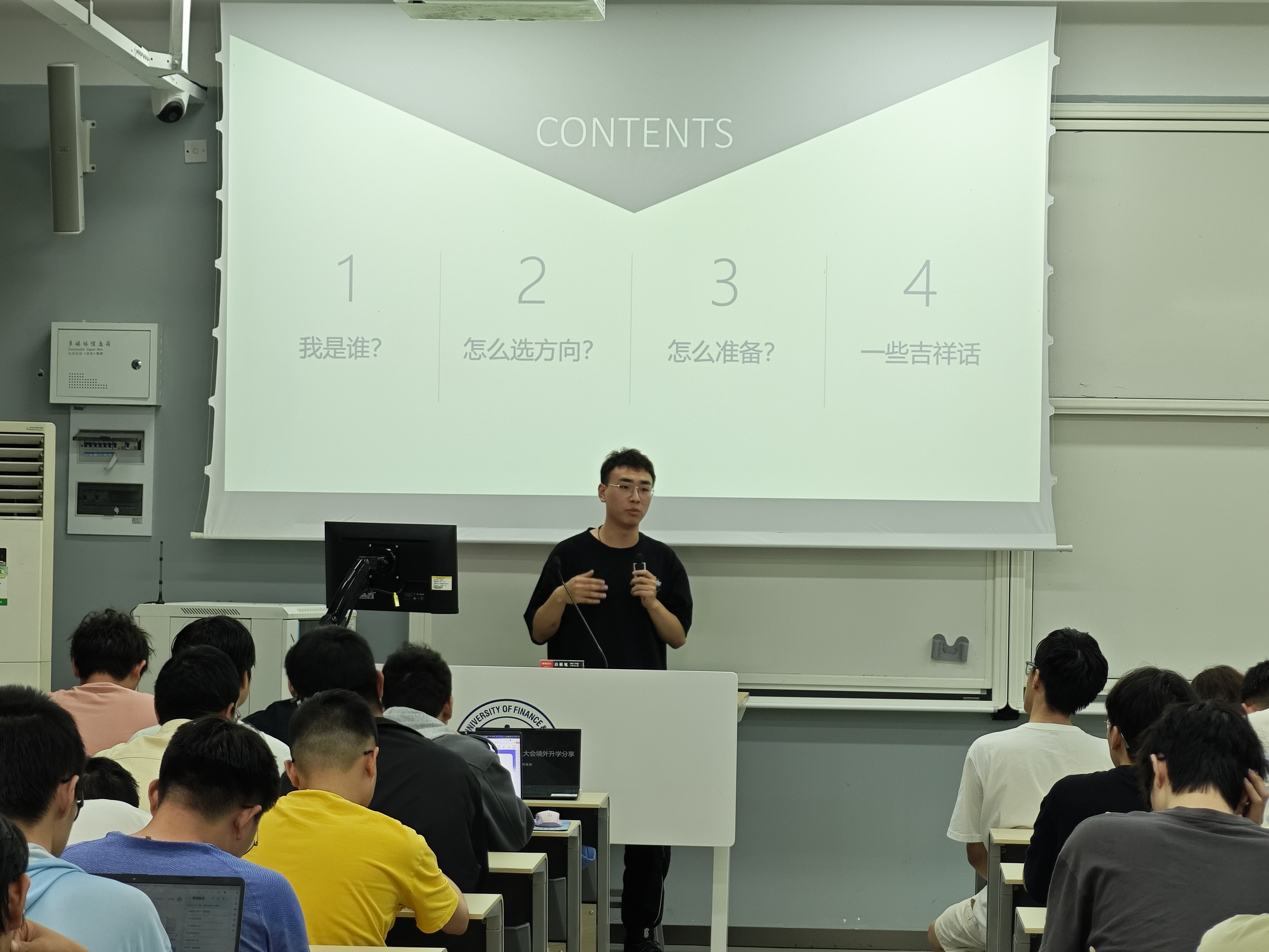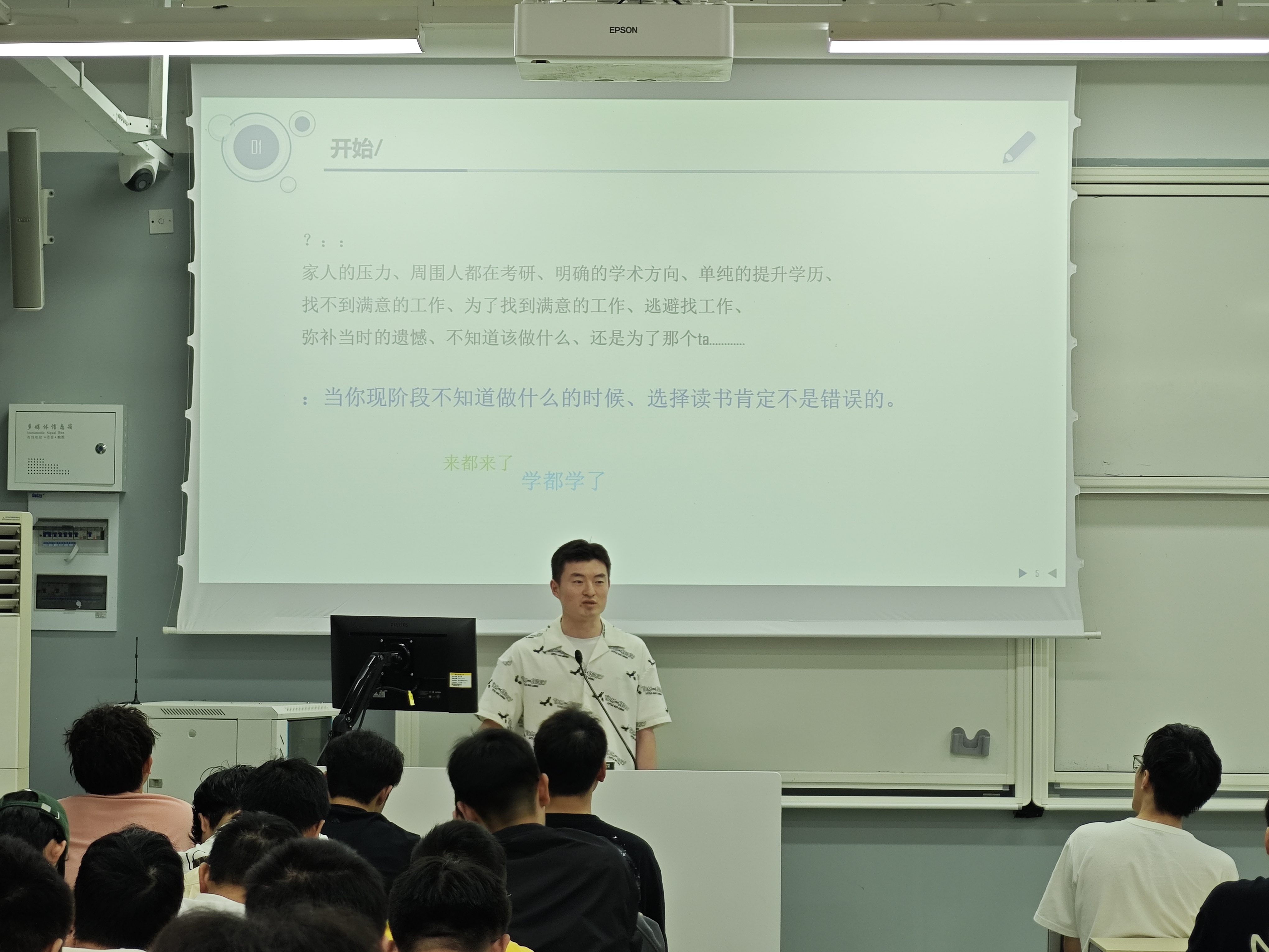 会上,朱凌老师详细介绍了考研形势,并对毕业生考研方向选择以及考研策略做出针对性指导。希望同学们能够做好考研复习计划,注重劳逸结合。吴轶韵老师以选择、心态、健康三个关键词为题,为毕业生提出宝贵建议。洪宝华老师分享了2023、2024年学院毕业生升学、就业情况,引导同学们尽早做好职业规划,明确职业方向。吴泽勇老师就毕业相关注意事项为同学们提供了丰富信息,助力学生顺利毕业。2024届升学优秀学生代表张有民、胡家赫分别从考研、出国层面分享了自己的实战经验,从学校选择、复习时间安排、学习方法、应试技巧等方面分享了心得体会。现场氛围融洽、干货满满,赢得了同学们的阵阵掌声。