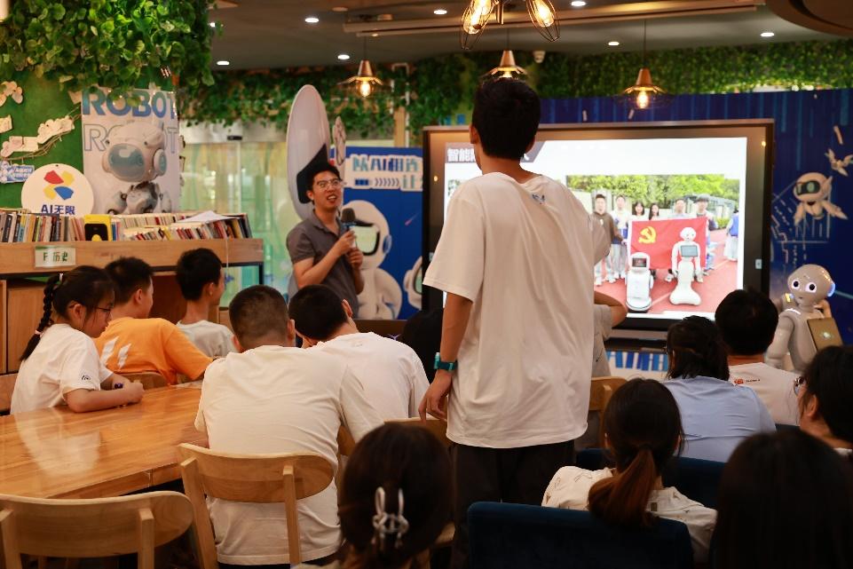 最后,Pepper机器人团队负责人王钰为学生们介绍了Pepper机器人。王钰从机器人动作设计、视频播放技术和语言交流能力三部分介绍了Pepper机器人的开发,加深了学生们对Pepper和人工智能在人机交互领域应用的理解。学生们认真听讲,积极互动,对Pepper机器人表现出浓厚兴趣。