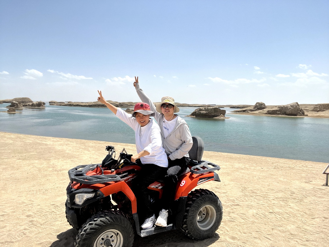7月9日至10日,行程转向青海“小众秘境”:9日清晨途经“直通天际”的315U型公路,壮阔视角引众人打卡;随后抵达世界唯一的乌素特水上雅丹,风蚀土丘伫立湖中,阳光下车行其间宛如穿越火星。10日走进翡翠湖,数十个盐池因矿物质浓度差异呈绿、蓝、青等色,老师们沿盐滩漫步,沉浸式感受盐湖奇幻之美。