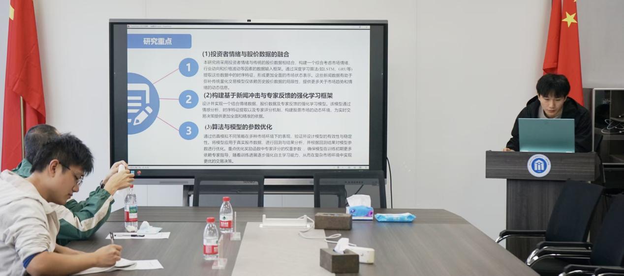 在9-404教室顺利举办了2025年第4期(总第27期)“数智钱潮”研究生论坛。本期论坛由学术部同学主持,邀请了刘东威博士、胡扬帆博士担任点评专家,吸引了众多研究生积极参与和热烈交流。论坛共有6名研究生进行学术汇报,内容涵盖量化交易策略、股权交易模型、助播影响、光伏面板缺陷检测、多传感器系统等多个前沿研究方向。