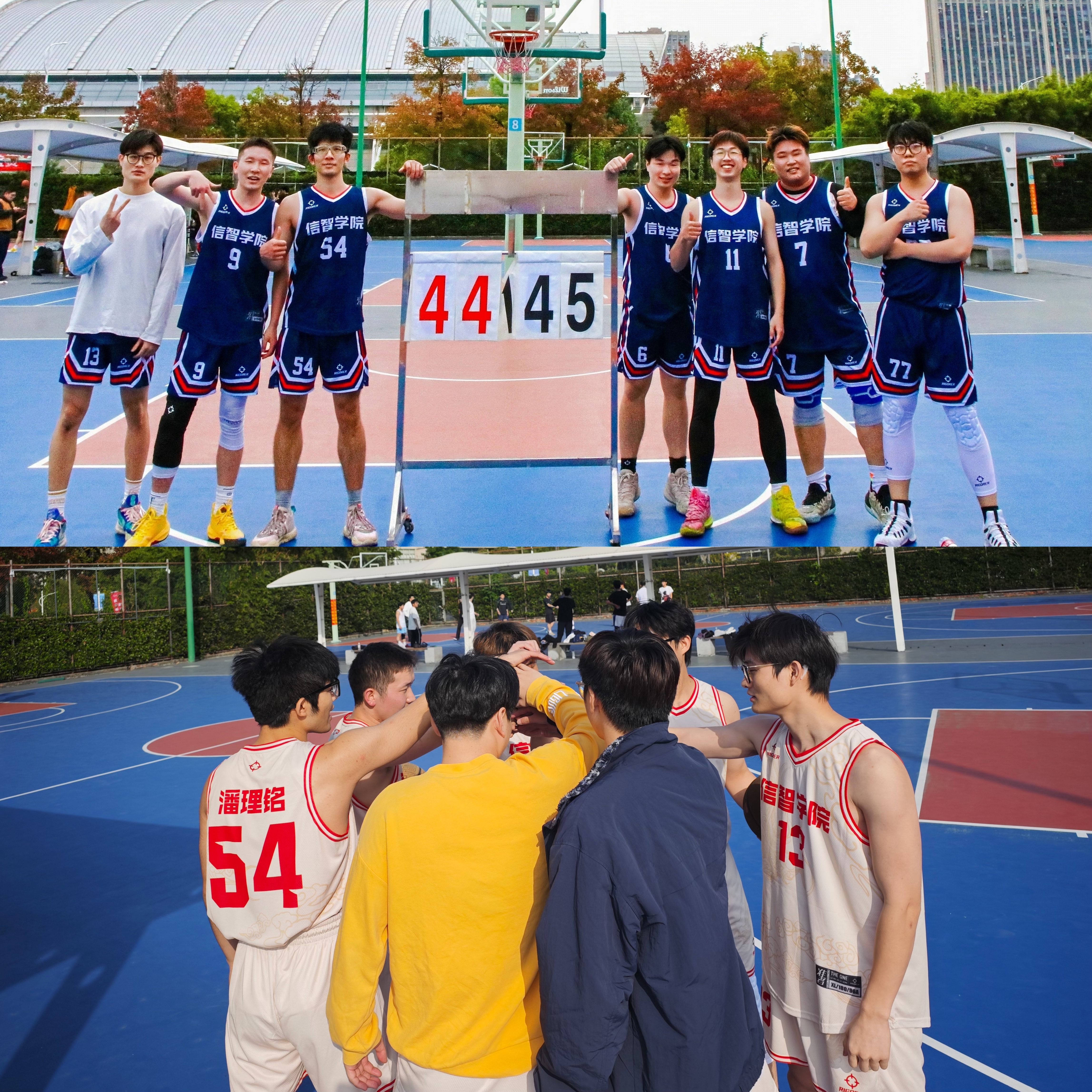 在半决赛与数科学院的对抗中,比赛进程因场地与天气原因一度被迫中断。赛事封表、节奏打乱,意外的波折并未磨灭队员们的斗志。补赛阶段双方球队展开胶着的拉锯战,尽管最终以32:35的微弱差距憾负,但这场硬仗充分彰显了信智男篮坚韧不拔的意志品质。