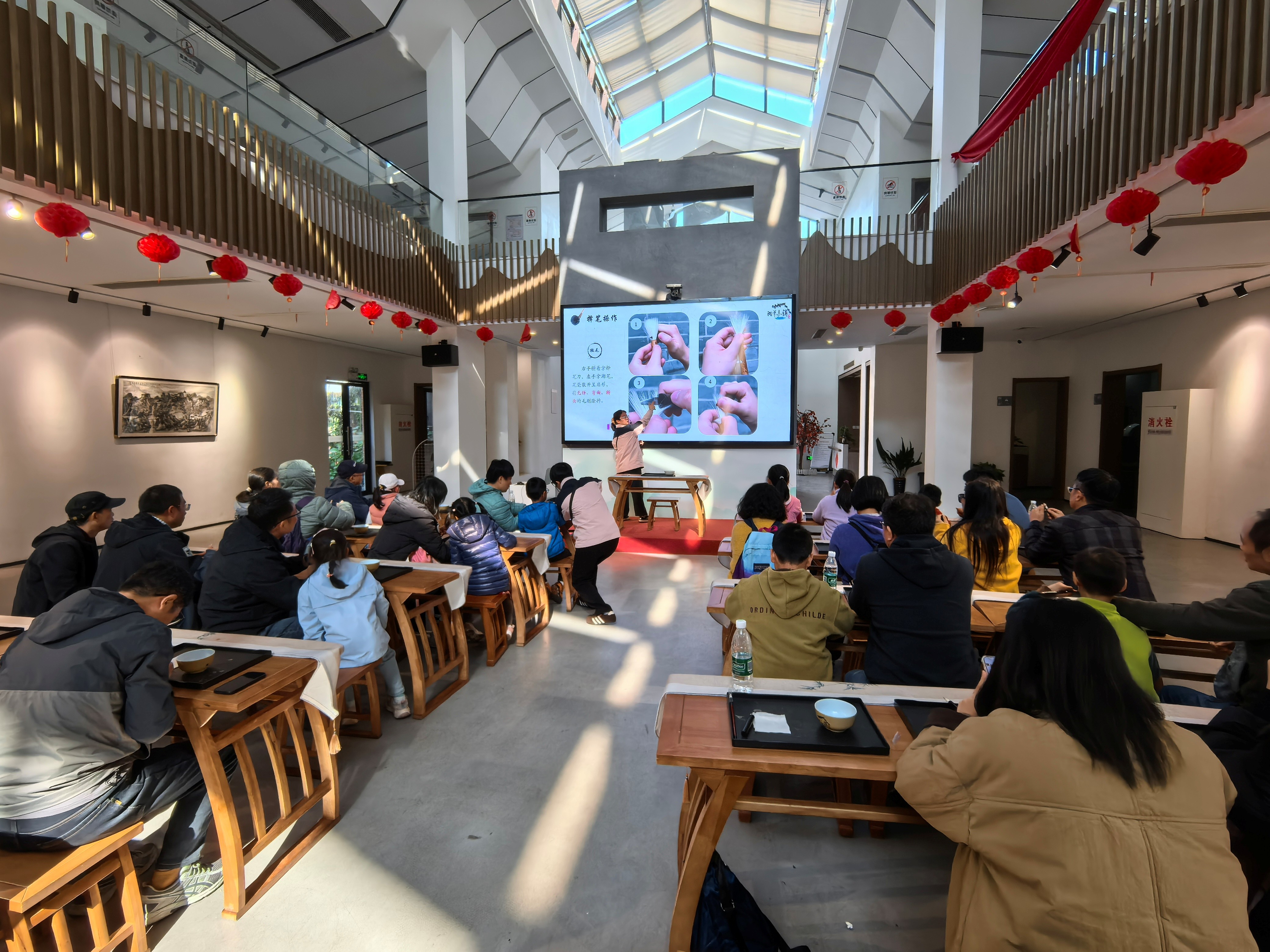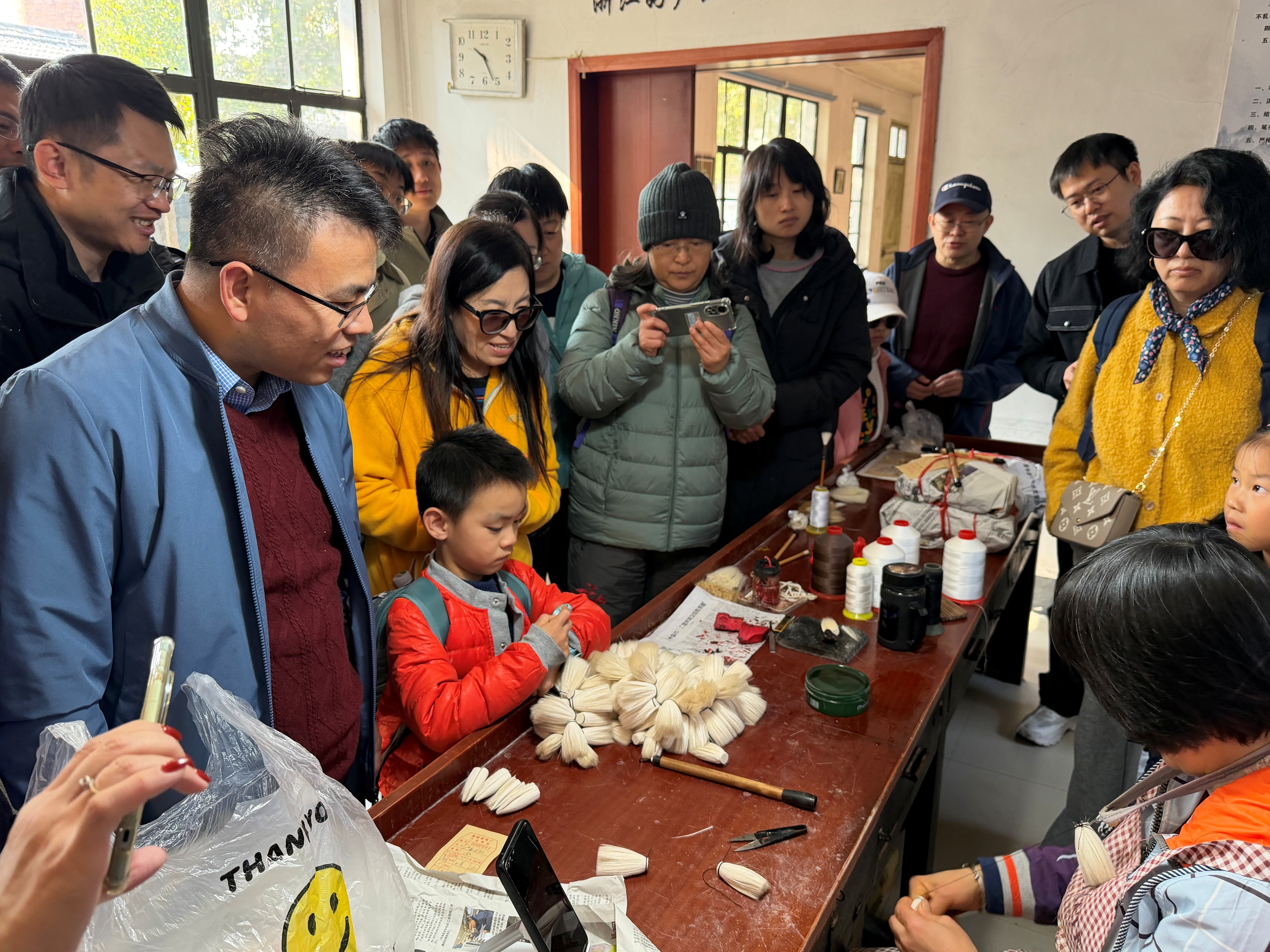 “软毫裁得秋光细,匠心织就笔墨香”。行至湖笔小镇,非遗技艺的魅力扑面而来。师生们走进制笔工坊:看匠人们捻毫、修锋的细腻手法,亲手体验湖笔制作的关键工序,在参观工厂的过程中,读懂“一支笔从毛到器”的千年传承,指尖的墨香成了秋日出游的独特纪念。