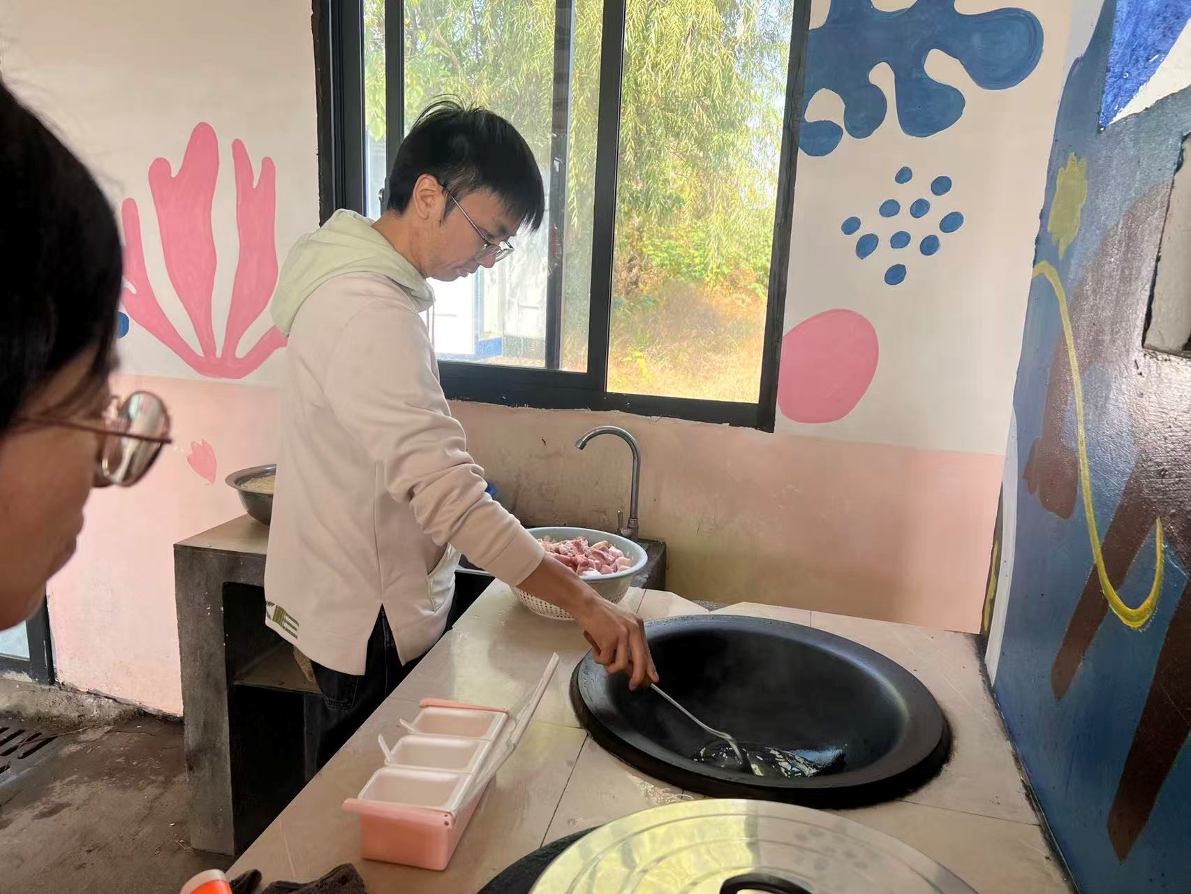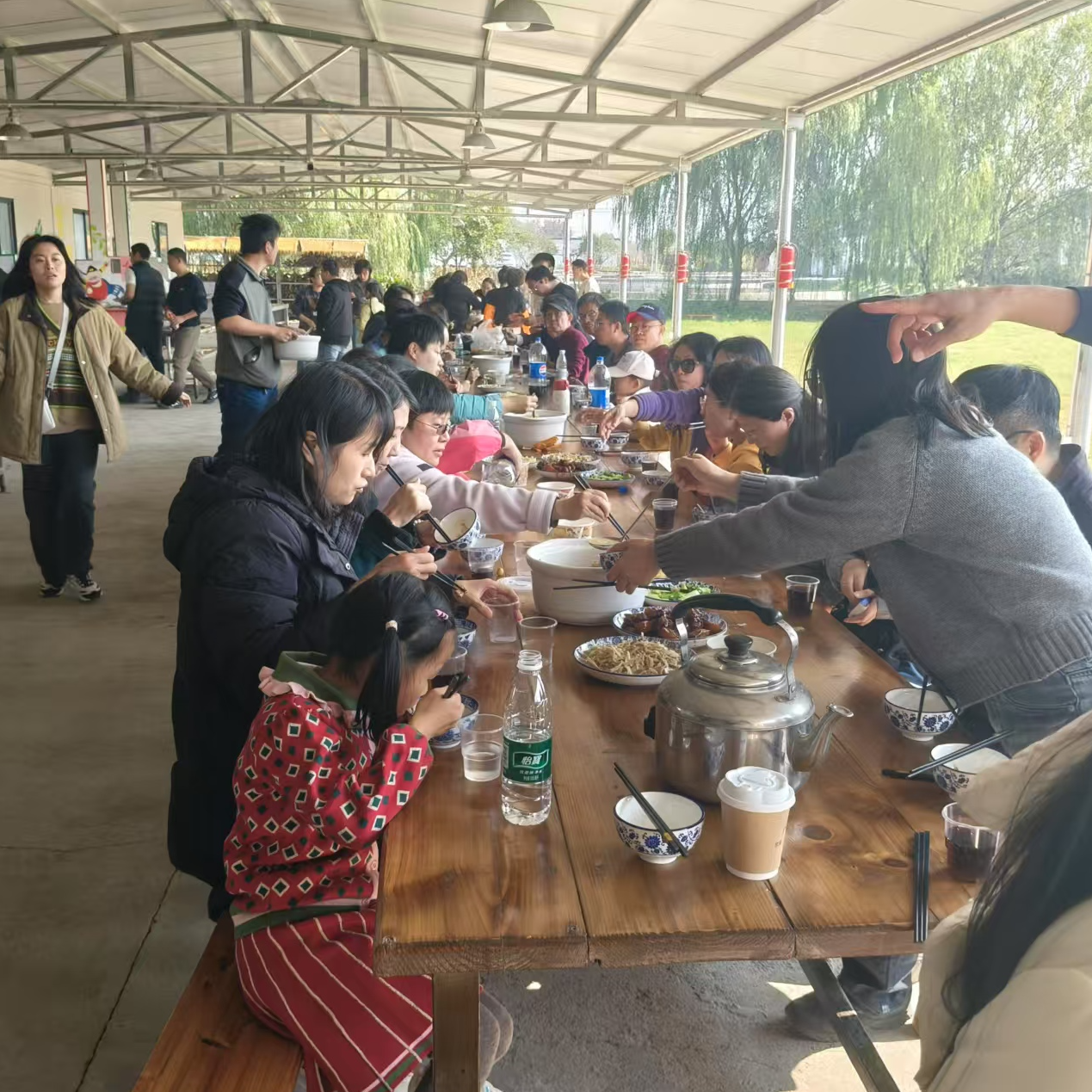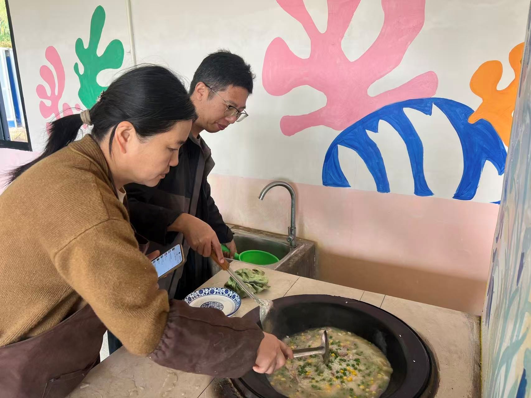 “野灶炊烟乡味起,分工协作乐相宜”。正午时分,窑里村的田野间飘起烟火气。老师们开启“野火饭”体验,有人拾柴生火,有人择菜备料,带娃的家长们也带着小朋友帮忙递碗擦桌,欢声笑语裹着饭菜香漫过田间。大家虽沾了些烟火气,脸上的笑意却格外真切——这乡野间的一餐,是味蕾的满足,更是团队默契的升温。