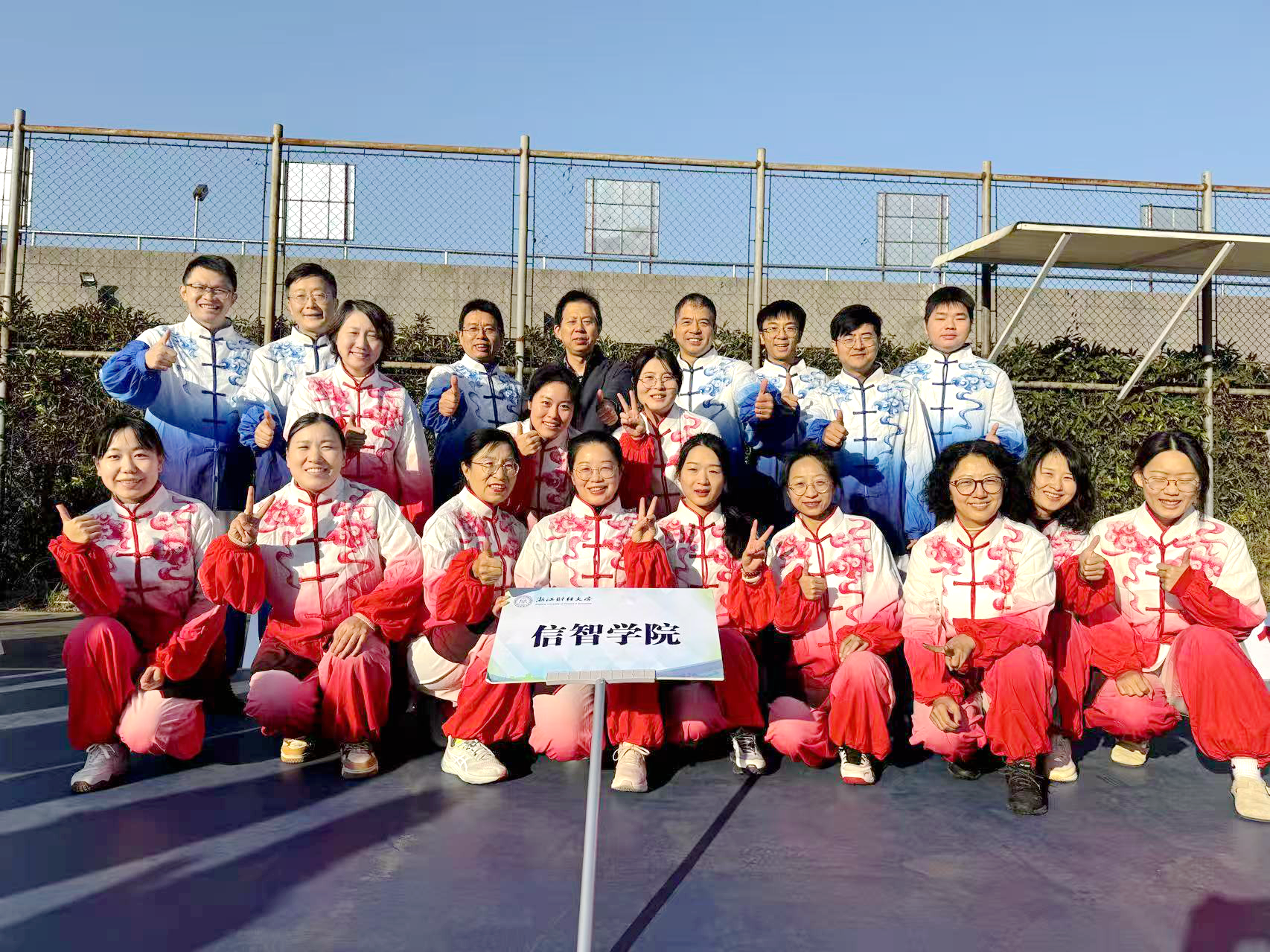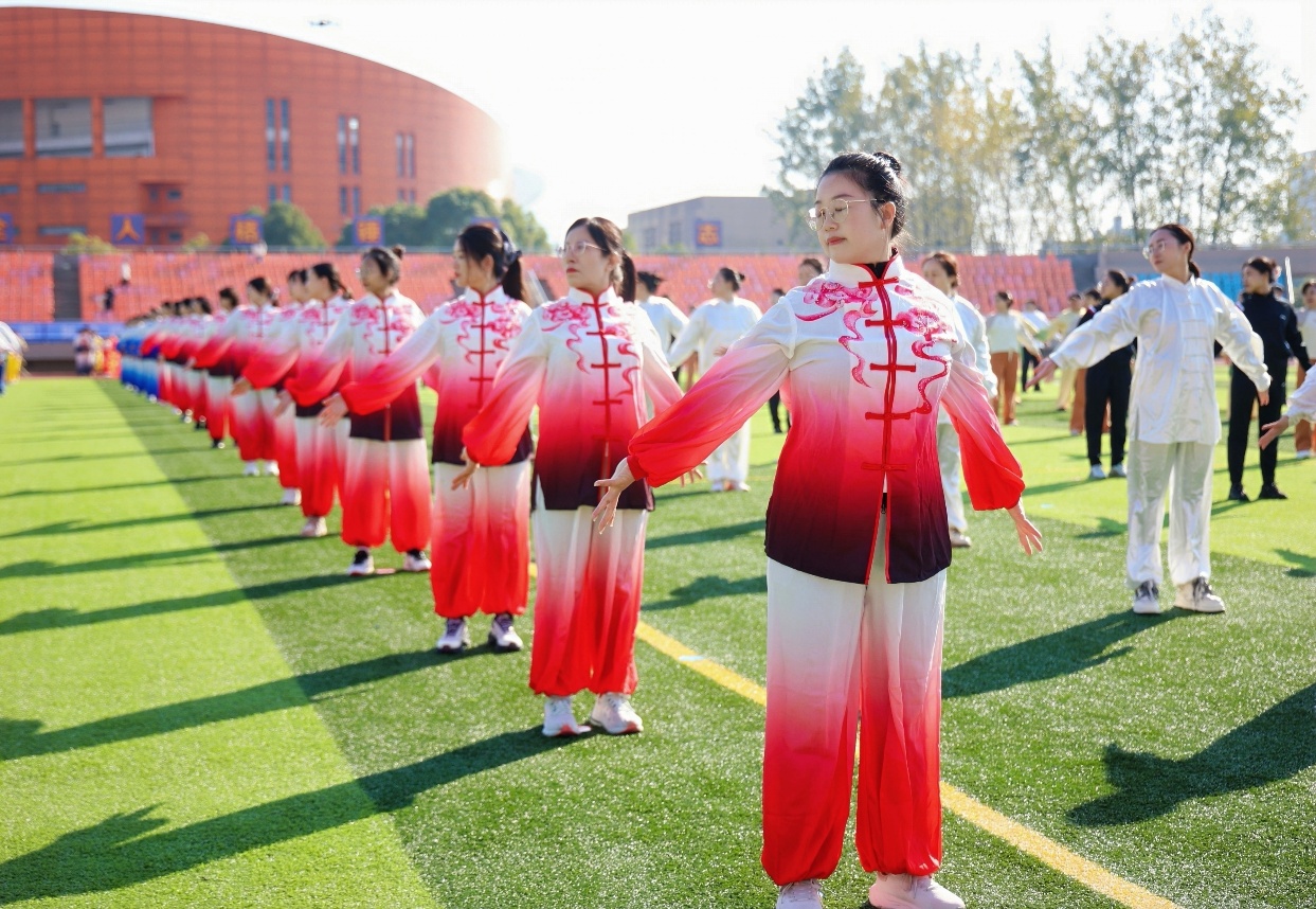 这份沉甸甸的桂冠,离不开团队成员强烈的集体荣誉感与饱满的参与热情。赛事启动之初,学院教职工积极响应号召、踊跃报名,迅速组建起一支充满活力与战斗力的参赛队伍。为精进技艺、提升整体演练水平,队员们主动利用课余时间开展自主训练,更组团赴学校篮球馆向专业指导教师求教。从基础手型步型的打磨到呼吸节奏的默契配合,从单个招式的精准校正到整体队形的协调统一,队员们虚心钻研、反复切磋,办公室、走廊间常能见到他们三五成群研讨动作要领的身影。“周二、周四常规练,赛前一周集中练” 的备战节奏,成为这支队伍冲刺冠军的真实写照。数周训练中,全体队员全心投入、毫不懈怠,既以高标准严格要求自我,更注重团队协作,相互指导纠正细节偏差、共同磨合提升整体效果,用坚持与专注筑牢夺冠根基。