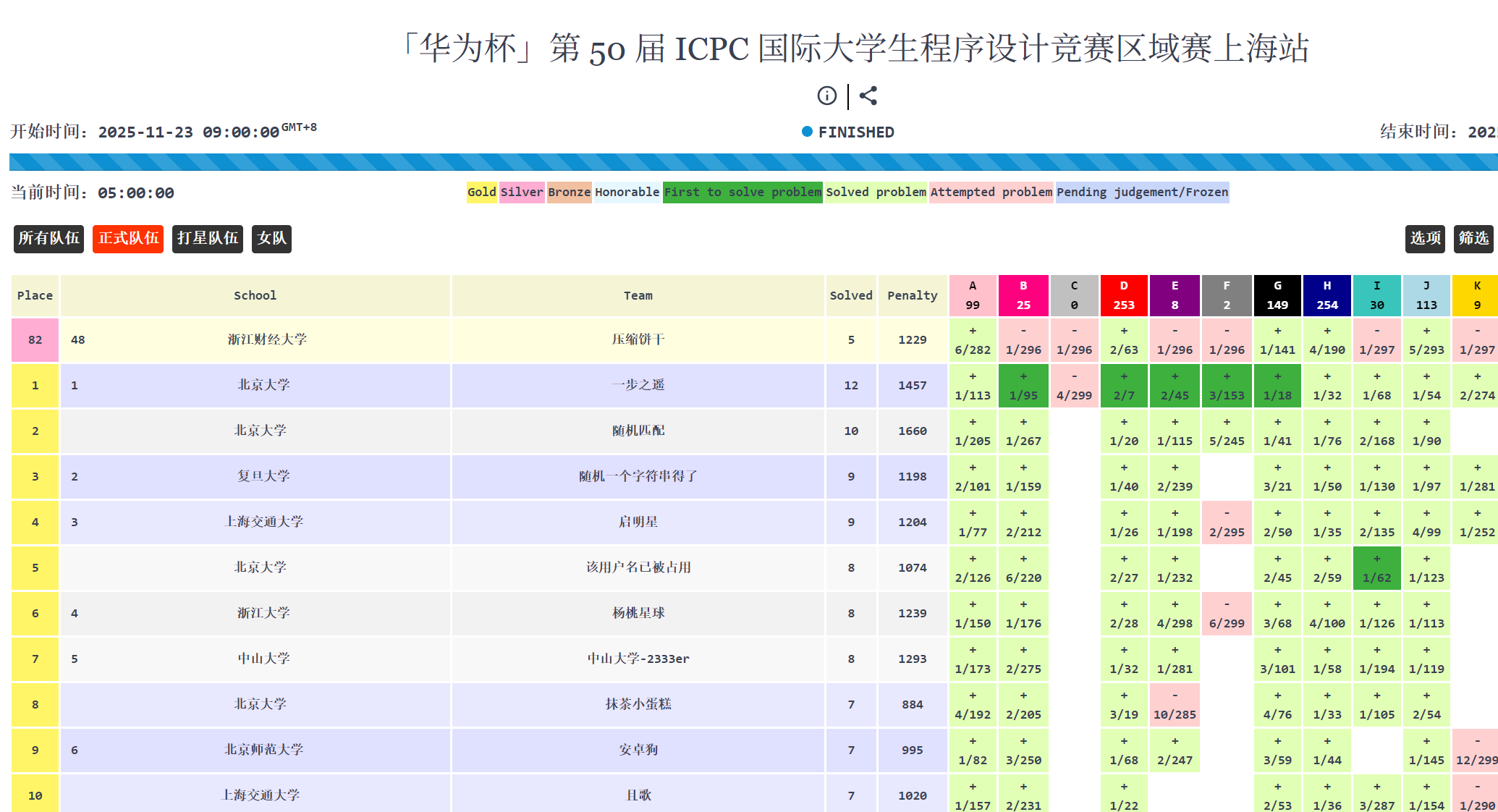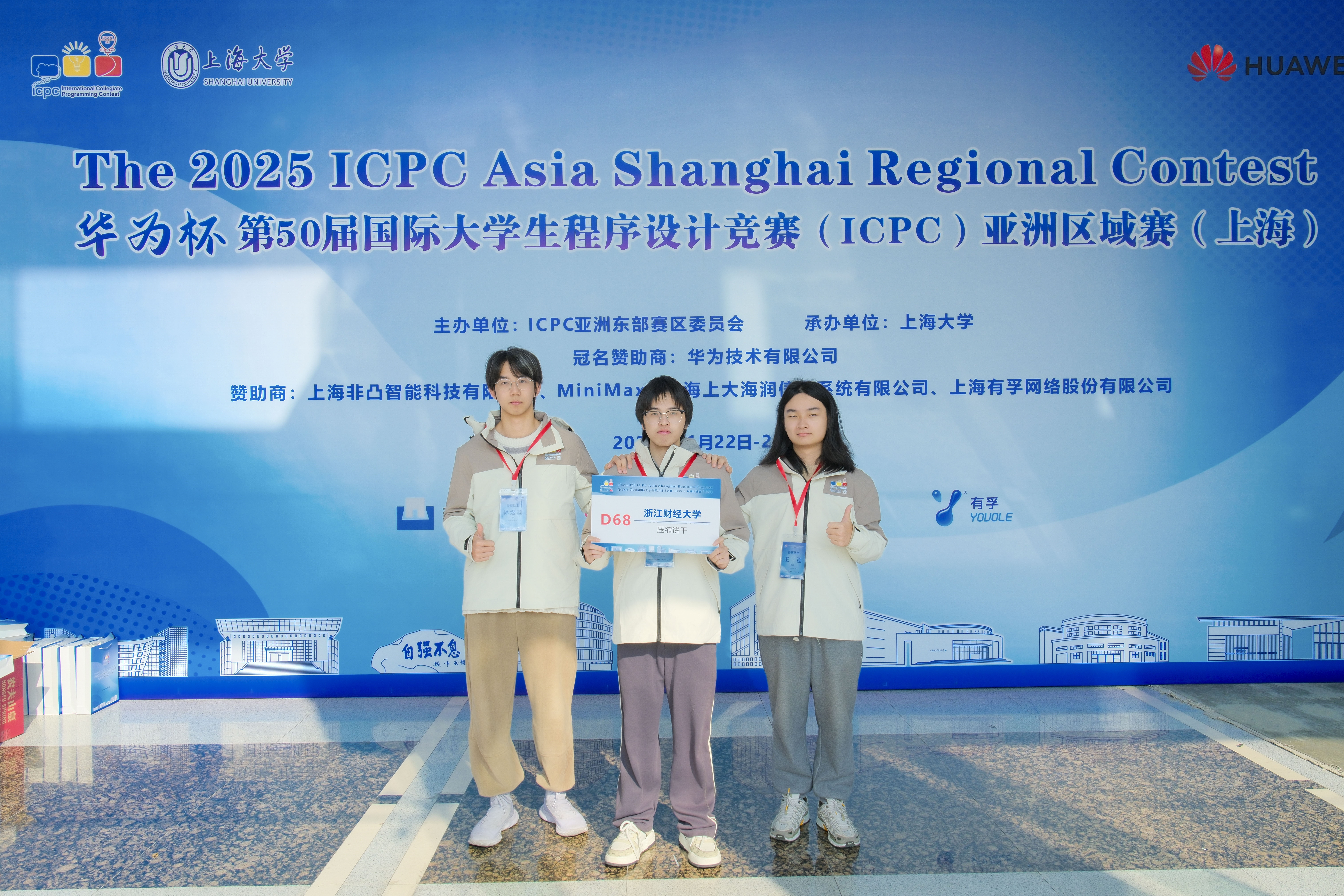 2025年11月22日-23日,“华为杯”第50届国际大学生程序设计竞赛(ICPC)亚洲区域赛(上海)在上海大学宝山校区体育馆圆满举行。来自221所高校的356支优秀队伍参赛,编程精英云集,以智慧碰撞灵感,以技术角逐巅峰。30支队伍获得金奖、60支队伍获得银奖、90支队伍获得铜奖。来自北京大学的“一步之遥”队成功解出12题,荣获冠军;来自复旦大学的“随机一个字符串得了”队获得亚军;来自上海交通大学的“启明星”队获得季军。