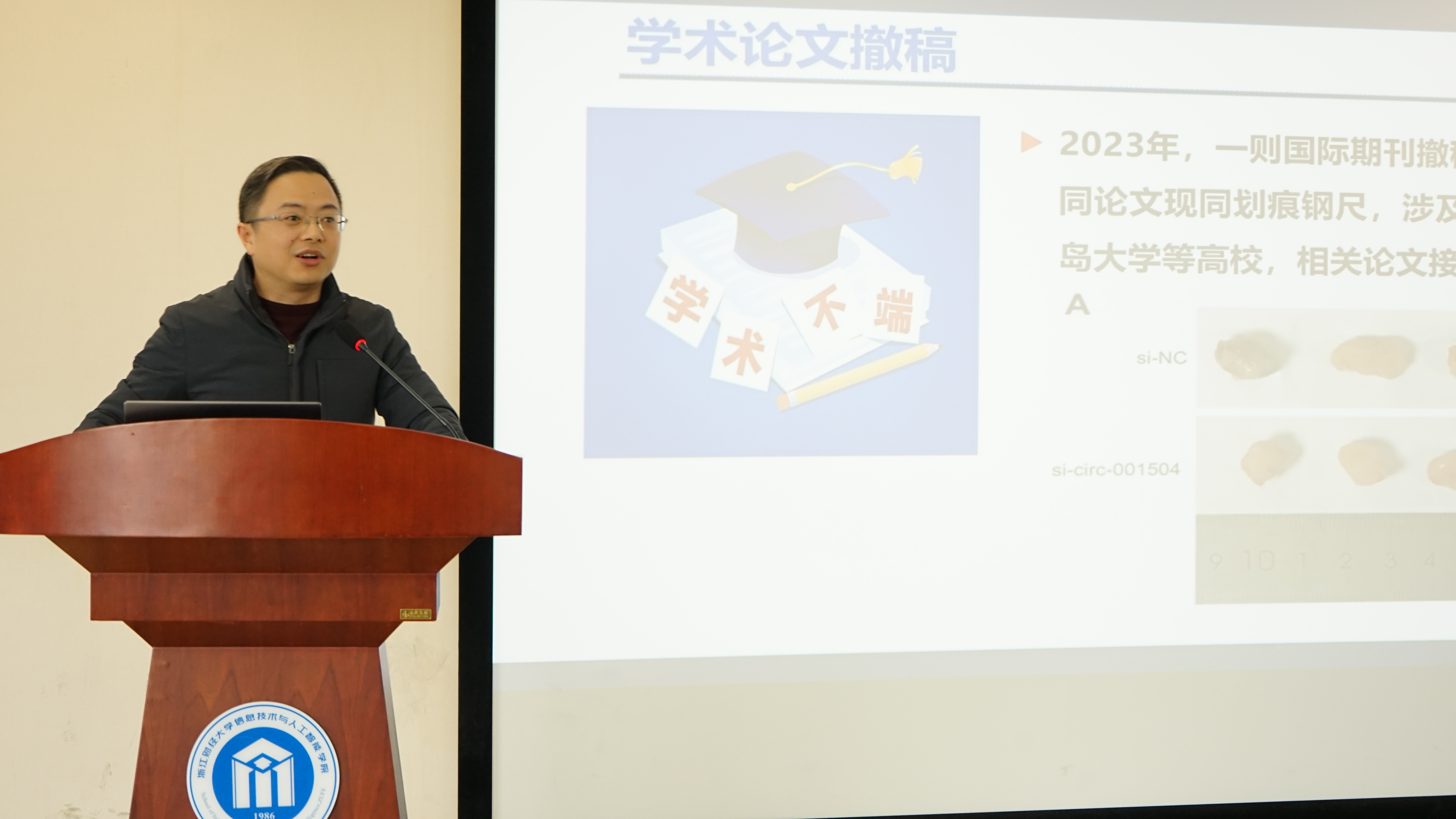 科研工作实际展开,阐述了科研诚信在学术研究中的核心地位,强调科研诚信是学术创新的基石,更是教师职业素养的重要体现,关系到学院科研事业的健康发展和声誉建设。随后,林剑副院长结合国内外典型学术失信案例,深入剖析了抄袭剽窃、数据造假、一稿多投等行为的危害及相应后果,让教职工们直观感受到坚守科研诚信的重要性。