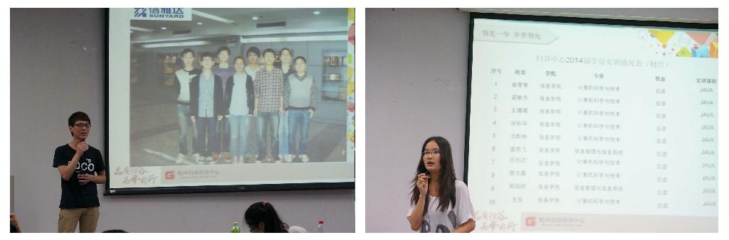 浙大网新集团仿真实训中心黄经理首先介绍了网新历史和业务架构,而后围绕“就业,你拿什么来竞争”,从中心概况、仿真实训、课程体系、实训平台、服务体系等五个方面展开宣讲,让同学们对本次浙大网新软件外包实训计划有了详细的了解。随后,杭州归谷实训中心钱经理以“品质归谷,为梦前行”为主题,从2013年IT行业需求出发,介绍了归谷暑期软件外包实训课程的大致安排。