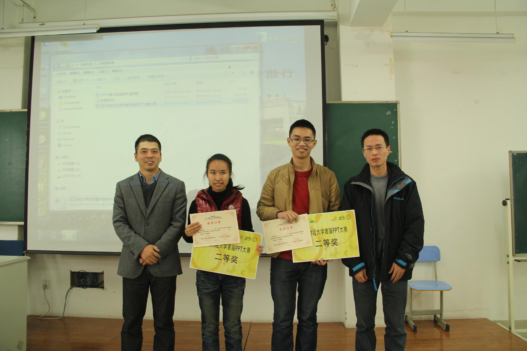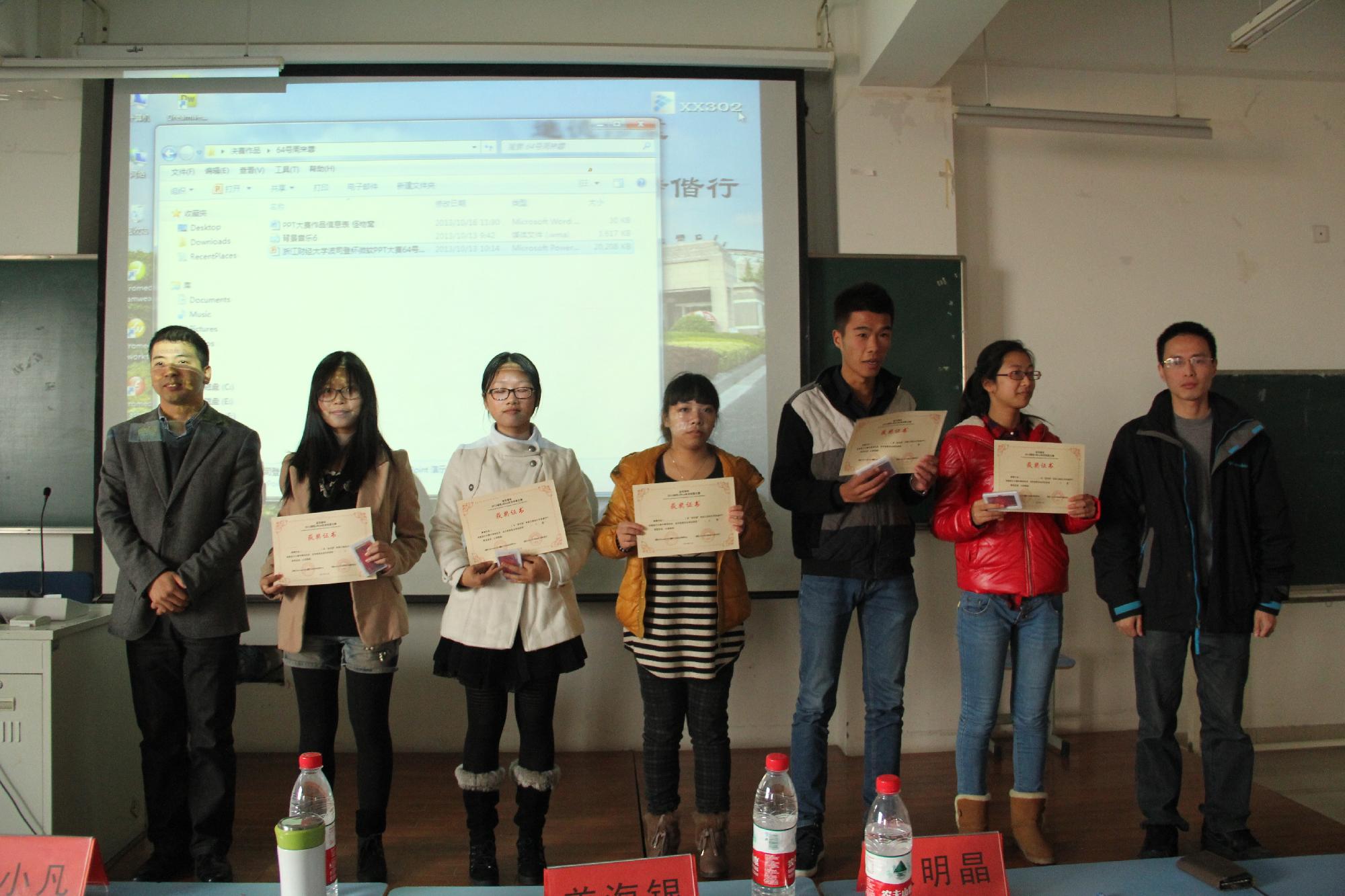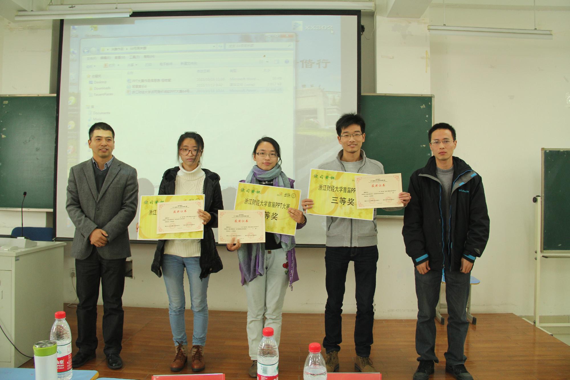 经过评委老师的一番精彩点评和现场计分,最后,来自信息学院的张馨慧的作品荣获本次PPT大赛一等奖,二等奖由李雅欣、吴姚迪获得;陈林灵、鲁佶瑶,周来蓉获三等奖;沈嘉伟、王雅婷、孙丽丽、张景阳、方宁宸获优胜奖。三位评委老师分别为获奖同学颁发了获奖证书,并与同学们合影留念。