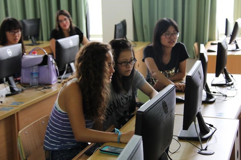 随着课程的开始,同学们都进入了学习的氛围。两星期的课程最终的考验是与外国同学一起完成一个project。为了完成作业,课下时间同学们都留在教室里一起讨论问题。