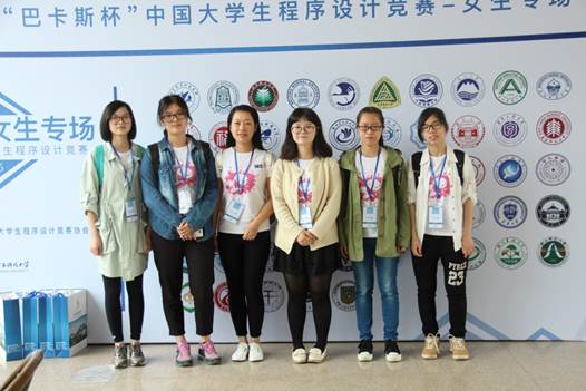 5月21-22日,首届"巴卡斯杯" 中国大学生程序设计竞赛女生赛在杭州电子科技大学举行,来自近60所高校的82支队伍参加了比赛,最终上海交通大学“靛蓝色的镇魂歌 ”队获得冠军。我校共有6位大一女生参赛,分别是:15信息朱怡阳,15计算机 王子雯,15国贸余晓婷以及