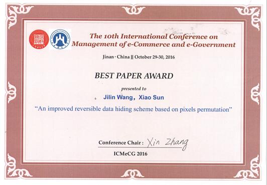 15级管理统计学专业研究生孙啸赴济南参加了第十届电子商务与电子政务管理国际会议(ICMeCG2016),并在分论坛就“An improved reversible data hiding scheme based on pixels permutation”主题做会议报告。经过前期的论文评审和分论坛的专家组评议,包括“An improved reversible data hiding scheme based on pixels permutation”在内的5篇论文获得本次会议的最佳论文奖。