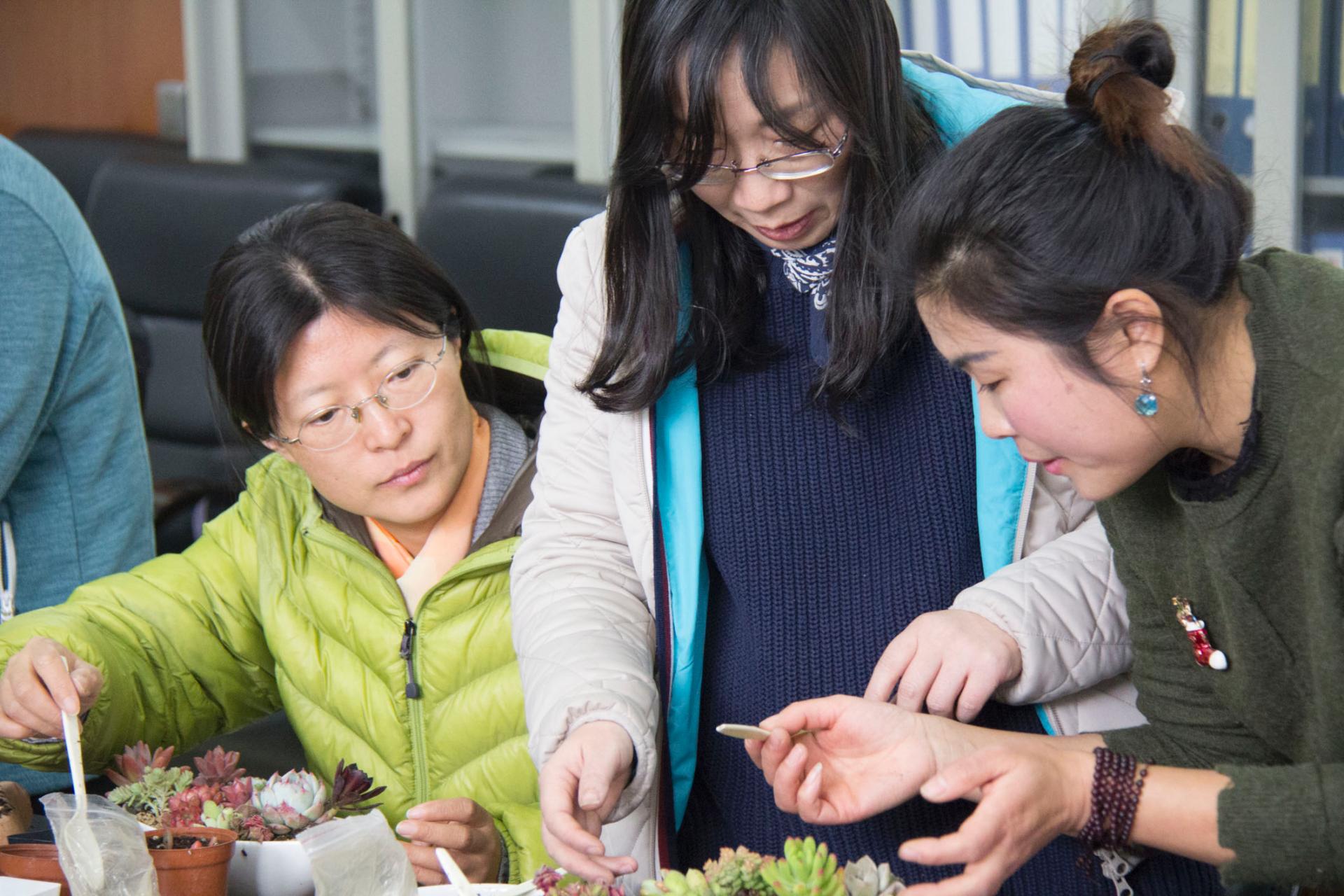 3月16日的下午,女神们热情洋溢的汇聚在9-404会议室,聆听了园艺老师从名称、养护、种植方法等各方面详细讲解后,在既有材料的基础上,发挥自己的想象力,搭配出形态各异,风格不同的小盆景,通过自己的创意使肉肉植物更加活泼生动。老师们围绕在一起,专注于栽培植物,或相互交流,或互相帮助,一片欢声笑语,在愉快轻松温馨的氛围中共同分享节日的快乐.