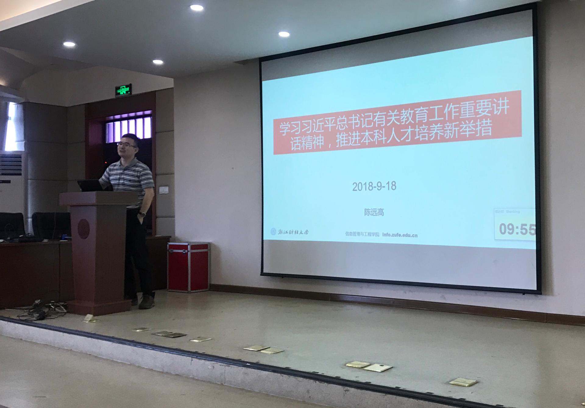 9月18日下午,信工学院副院长陈远高老师给学院全体教职工做了以“学习习近平总书记有关教育工作重要讲话精神,推进本科人才培养新举措”为主题的党课。