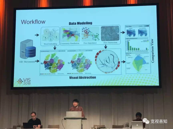 我校信息管理与工程学院软件工程系主任周志光博士,近年来研究方向专注于大数据简化表达与可视分析。本次工作,利用自然语言处理模型计算获取人群轨迹的语义关联,进而实现大规模城市移动数据的采样简化与可视表达,撰写的研究论文“Visual Abstraction of Large Scale Geospatial Origin-Destination Movement Data”,被IEEE VAST录用并做现场报告(Oral Presentation),进一步作为期刊推荐论文(TVCG Track),在线发表于中国计算机学会A类国际期刊IEEE Transactions on Visualization and Computer Graphics(TVCG)。这是我校第一次在IEEE VIS顶级会议上发表论文,也填补了我校近年来在中国计算机学会A类会议和期刊的空白。下图为我校周志光博士报告论文的现场。