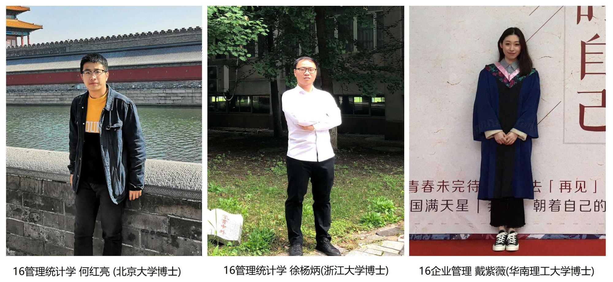 16级硕士生何红亮、徐杨炳、戴紫薇三位同学成功考取了北京大学、浙江大学、华南理工大学等985名校的博士研究生,考博率达到30%。