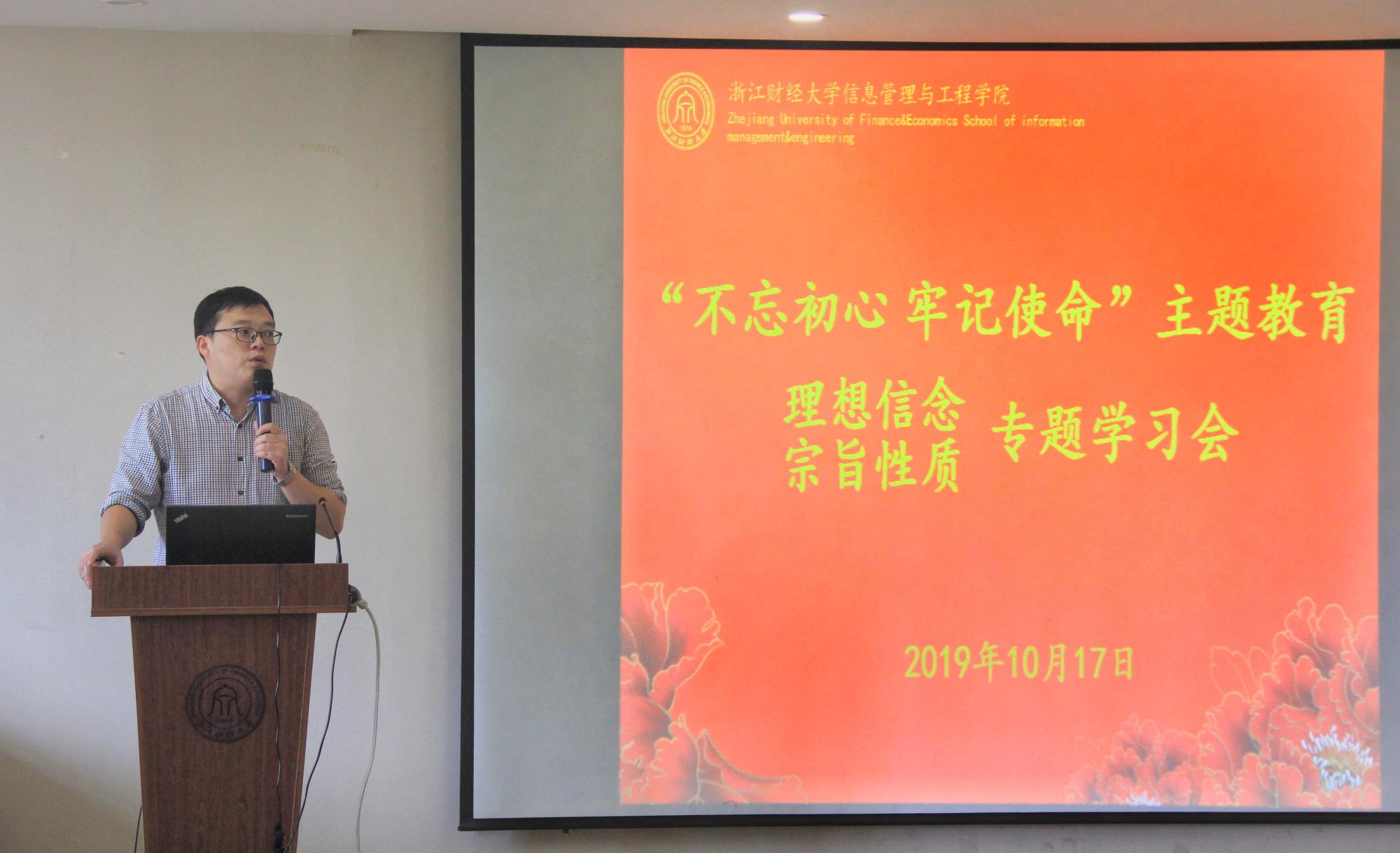 • 20191017日,信息管理与工程学院举行“不忘初心、牢记使命”主题教育全体党员理论学习大会,围绕“理想信念”和“宗旨性质”进行专题学习。学院全体教职工党员和学生党员出席学习大会,会议由学院党委副书记陆颋浩主持。