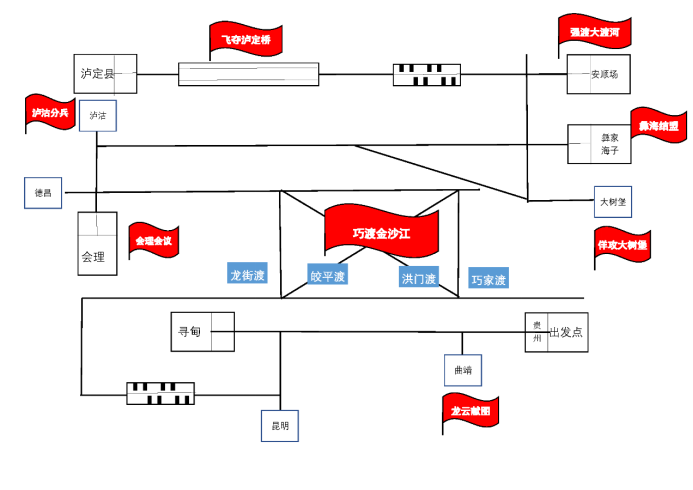 比赛得分:比赛出发地为“贵州”,目的地为“泸定县”,沿途有“寻甸”、“会理”、“彝家海子”、“安顺场”和“泸定县”等5个平台型站点,“曲靖”、“昆明”、“德昌”、“泸沽”和“大树堡”等5个梯形站点,“龙街渡”、“皎平渡”、“洪门渡”和“巧家渡”等4个通道型站点,每个平台型站点得分100分,梯形站点50分,通道型站点50分。