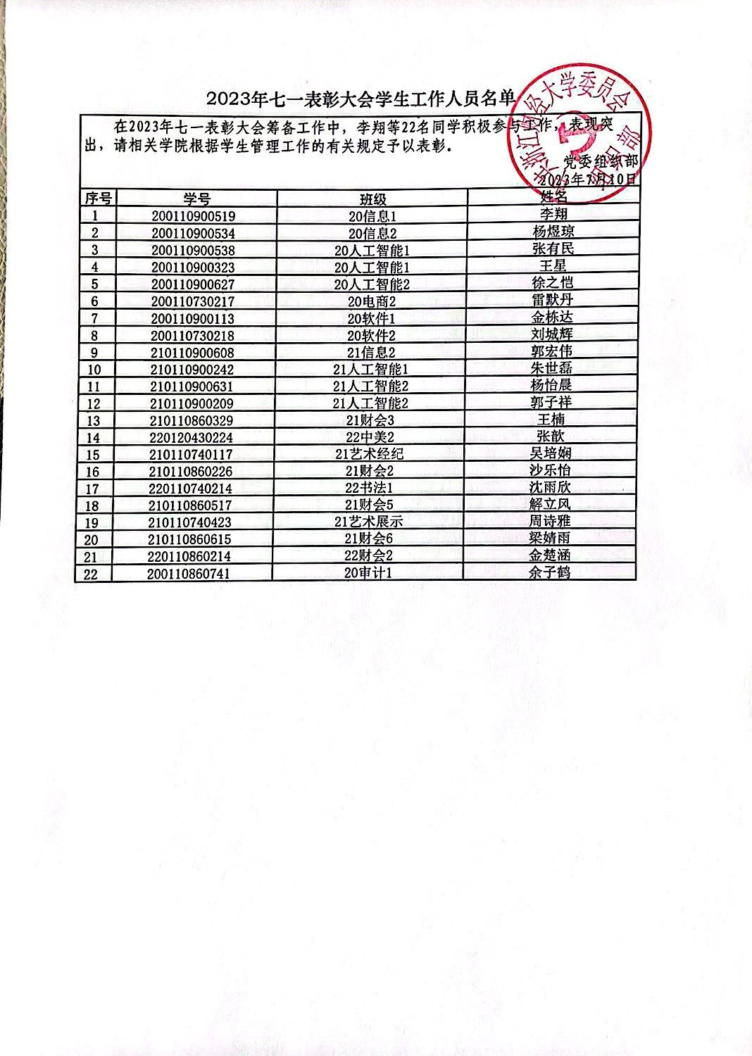 2023年6月29日,哔咔漫画 圆满完成了学校“循迹溯源学思想 砥砺奋进建新功”七一表彰大会的承办工作。期间,李翔等22名同学担任学生工作人员,扎实工作,甘于奉献,表现突出,积极协助校党委组织部和学院党委完成大会的筹备和组织工作,大会得到学校领导和师生党员的广泛好评。经校党委组织部研究决定,对上述同学进行通报表扬,以资鼓励。名单如下: