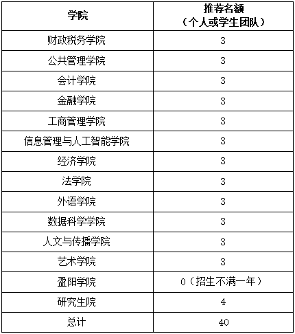 全校范围内以各学院、各部门为单位进行推荐,推荐名额如下表(研究生由研究生院组织申报与初评)。