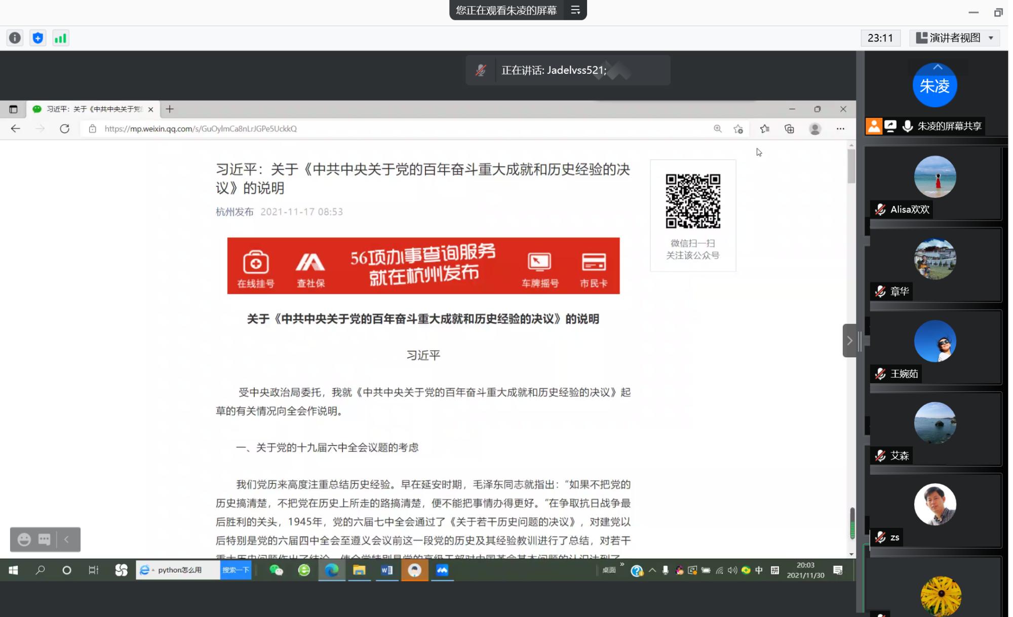 最后,支部党员就党的十九届六中全会精神、习近平总书记关于《中共中央关于党的百年奋斗重大成就和历史经验的决议》精神进行了学习。大家纷纷表示,通过对文件精神和党的百年奋斗重大成就和历史经验的学习了解,更加坚定了要在日常工作和学习中做好“红色根脉强基工程”的信念,不断将习近平新时代中国特色社会主义思想深入贯彻落实,弘扬伟大建党精神和红船精神、浙江精神、浙财精神。