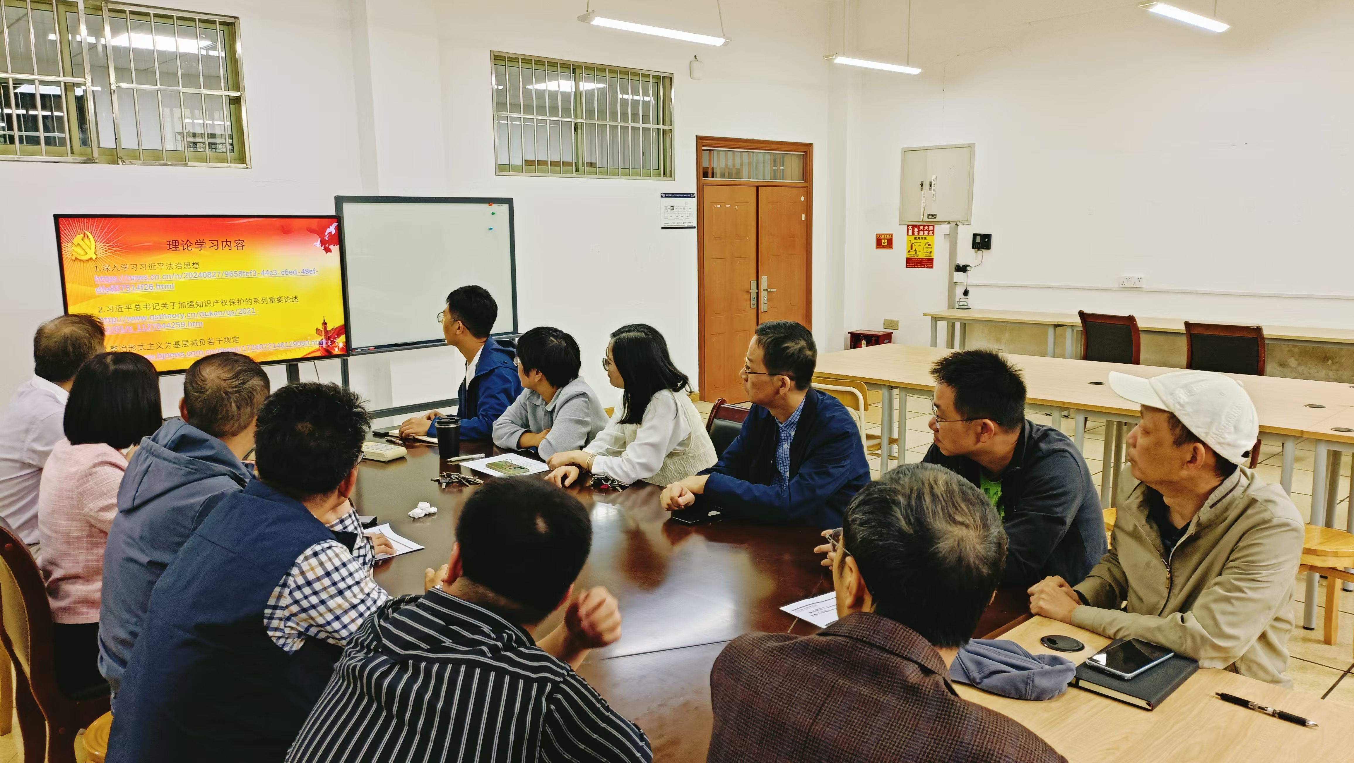 教工第一党支部在9103召开党员大会,开展习近平法治思想、习近平总书记关于加强知识产权保护的系列重要论述等理论学习,会议由支部书记朱凌主持,支部全体教师参加。