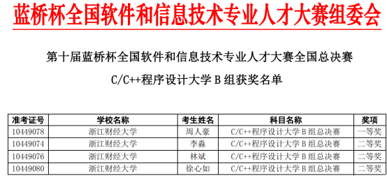 历时八个月的第十届“蓝桥杯”全国软件和信息技术专业人才大赛于近日在北京大学圆满结束。经过紧张激烈的角逐,我校四位入围决赛的同学全部获奖,共荣获一等奖1项、二等奖3项的好成绩。