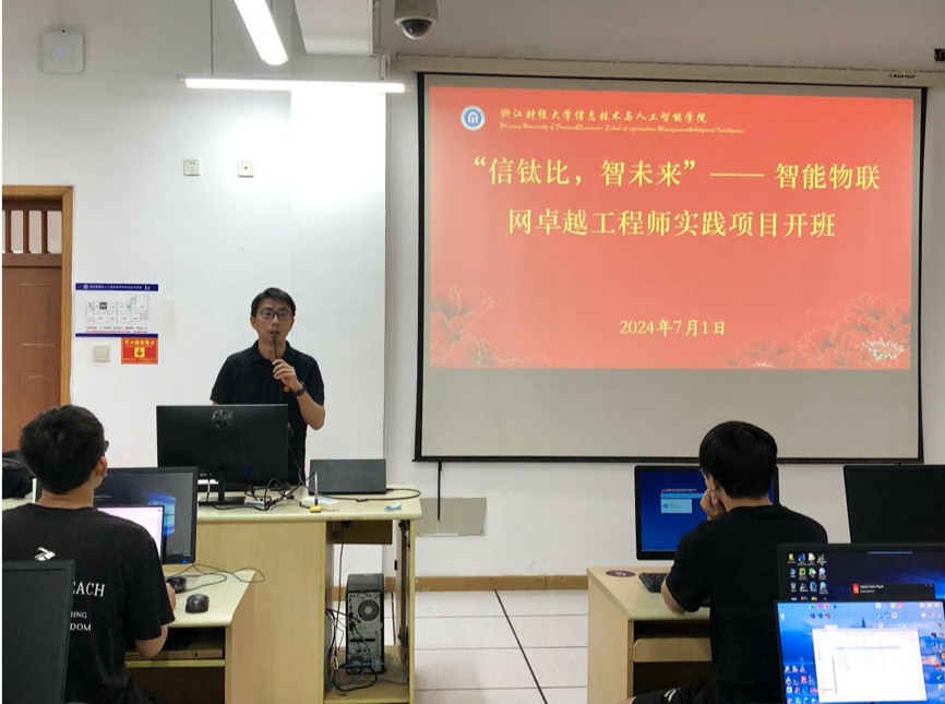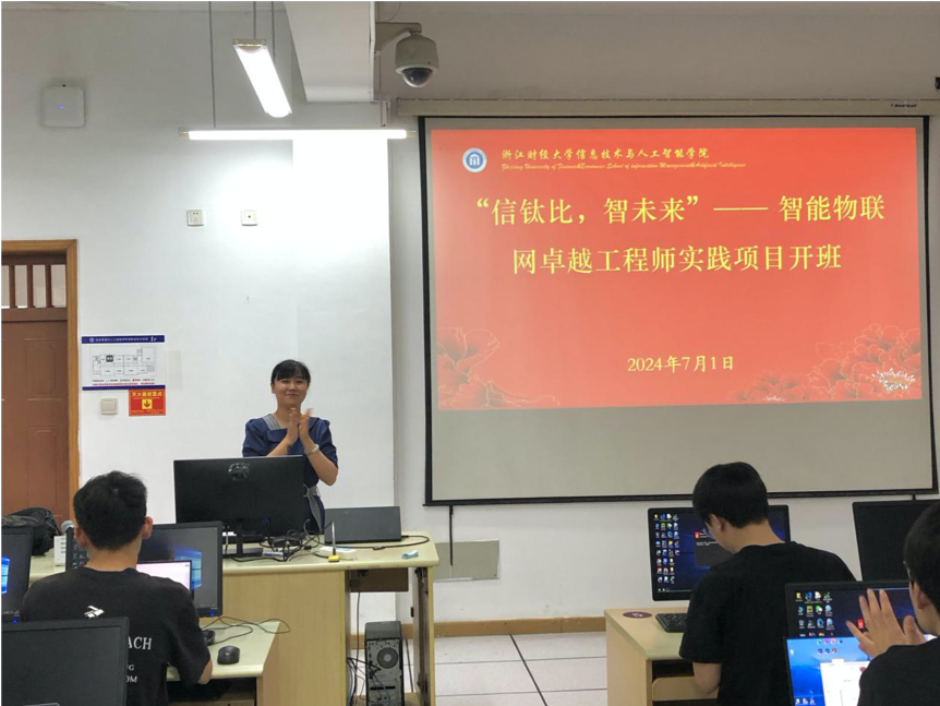 教学工作的鼎力支持和无私奉献。随后,朱院长向同学们介绍了此次智能物联网实践项目的背景、目的和重要性,她希望同学们能够珍惜这次宝贵的学习机会,充分发挥自己的才能和潜力,在实践中锻炼和提高自己的能力。