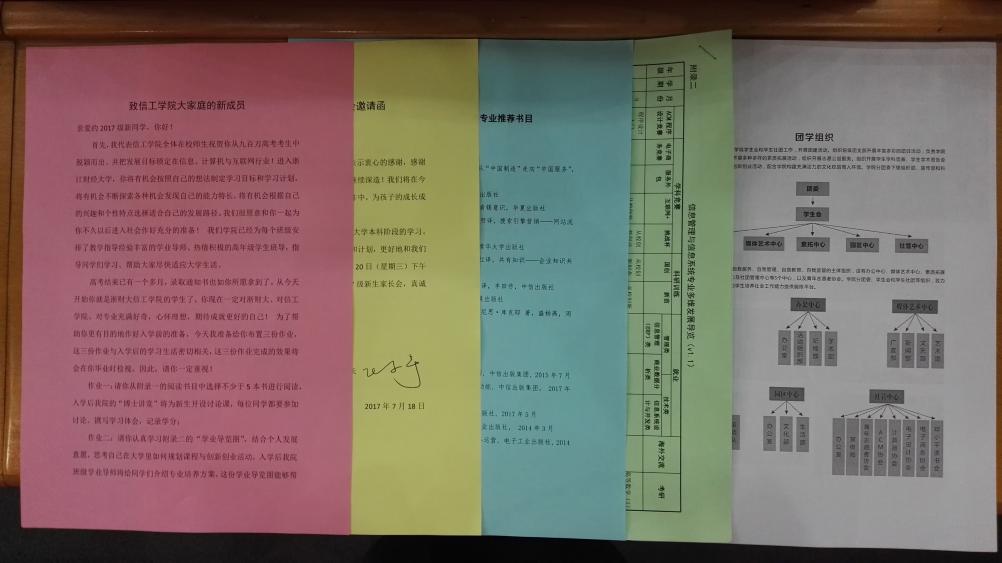 已向全国各地录取于信息管理与工程学院的新生寄发通知书,包括《录取通知书》、《信工学院2017级新生家长会邀请函》、《致信工学院大家庭的新成员》、《哔咔漫画