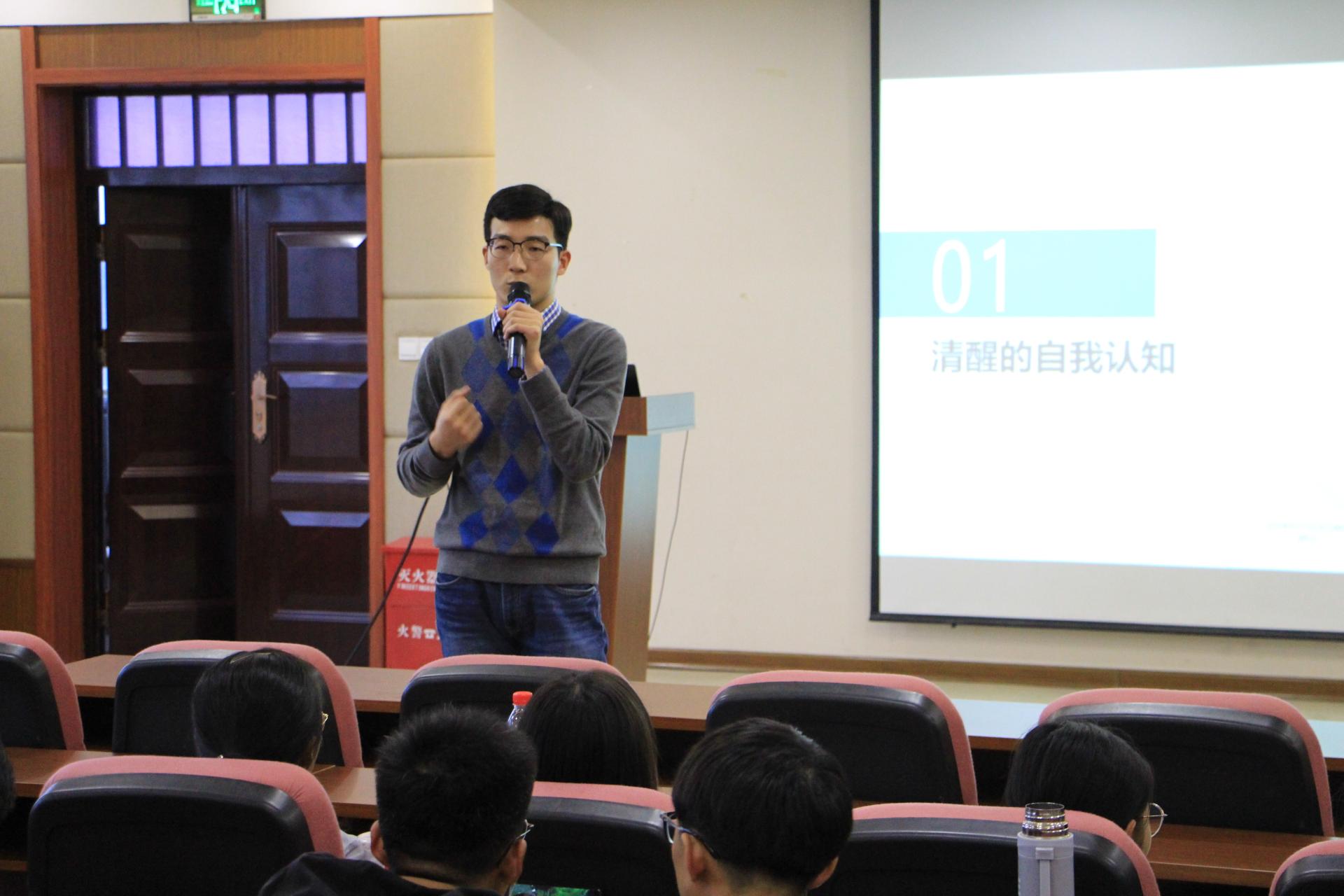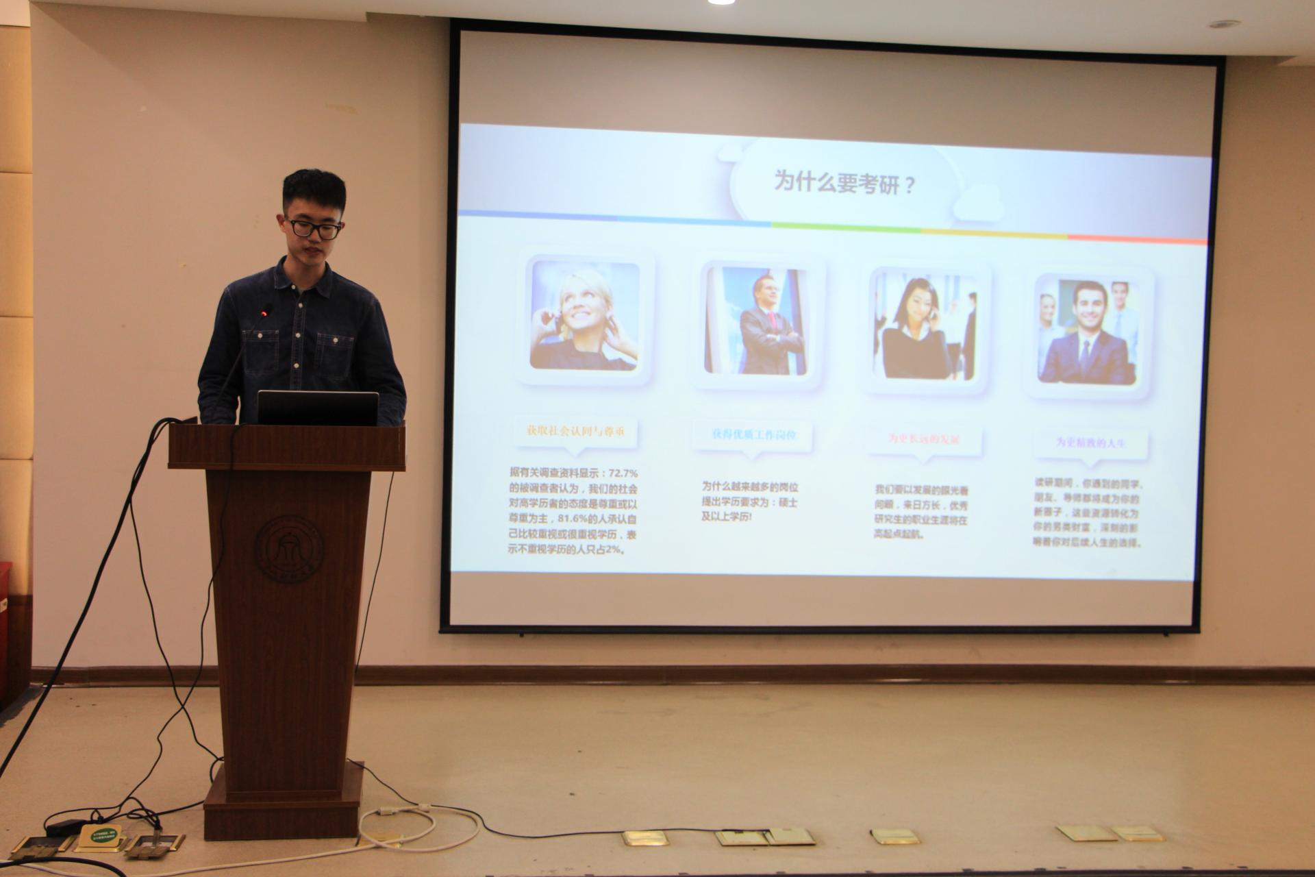 陈浪学长以“漫漫研路,砥砺前行”为主题,将他个人考研的方法心得分享给了我们。他不仅向我们讲述了考研的具体流程,还为我们提出了一些复习的建议,使在座各位同学都获益匪浅。