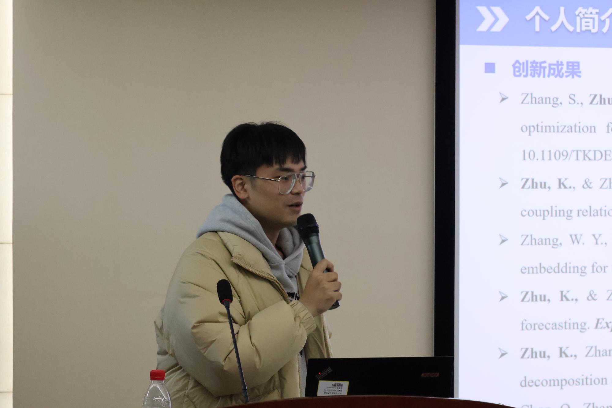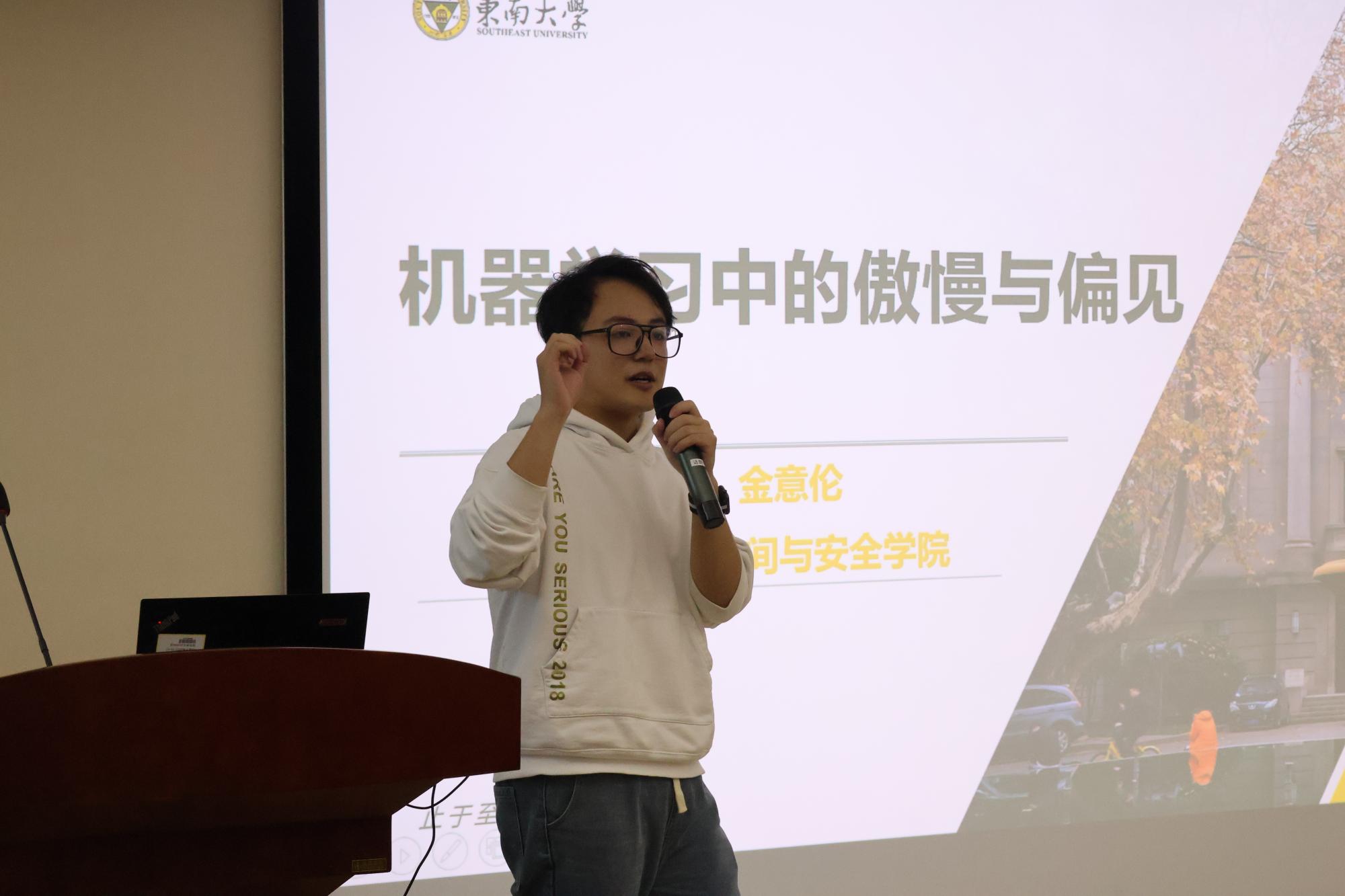 颁奖仪式后,三位获奖代表东南大学在读博士金意伦,浙江大学在读博士竺堃,浙江大学在读博士陈谦,分别向学弟学妹们分享了关于科研和考博方面的经验心得。金意伦校友针对当前人工智能的伦理公平问题,从宏观政策和微观应用角度详细介绍了人工智能伦理公平问题研究的必要性与迫切性,并分享了他近期的研究成果。竺堃校友为大家分享了自己阅读文献的心得,介绍了文献阅读的三次阅读法。陈谦校友分享了自己的申博经验,向大家介绍了申博前期准备、导师见面,及复试问题准备等。分享了对于“高质量论文”、“论文新颖度”的理解,希望尽快多发表高质量论文,为未来提供更多选择。