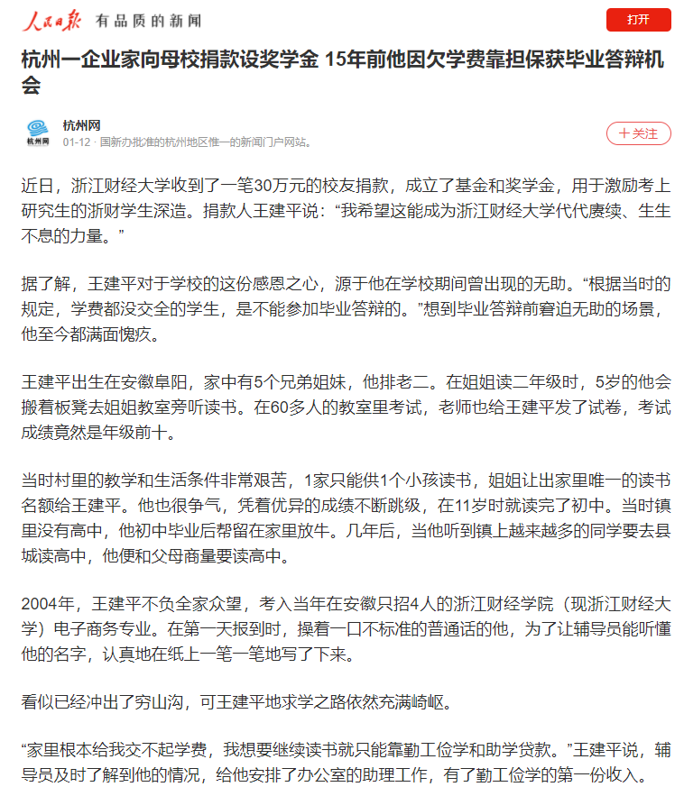 收到了一笔30万元的校友捐款,成立了基金和奖学金,用于激励考上研究生的浙财学生深造。捐款人王建平说:“我希望这能成为哔咔漫画