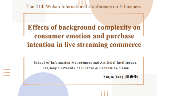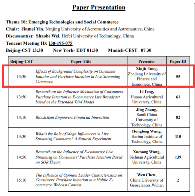 20级管理科学与工程专业研究生童鑫佳参加了本次会议,在线宣读了题为“Effects of background complexity on consumer emotion and purchase intention in live streaming commerce”的研究论文,并与参会专家学者们进行了深入的交流和讨论,得到了专家们的一致赞许和宝贵建议。