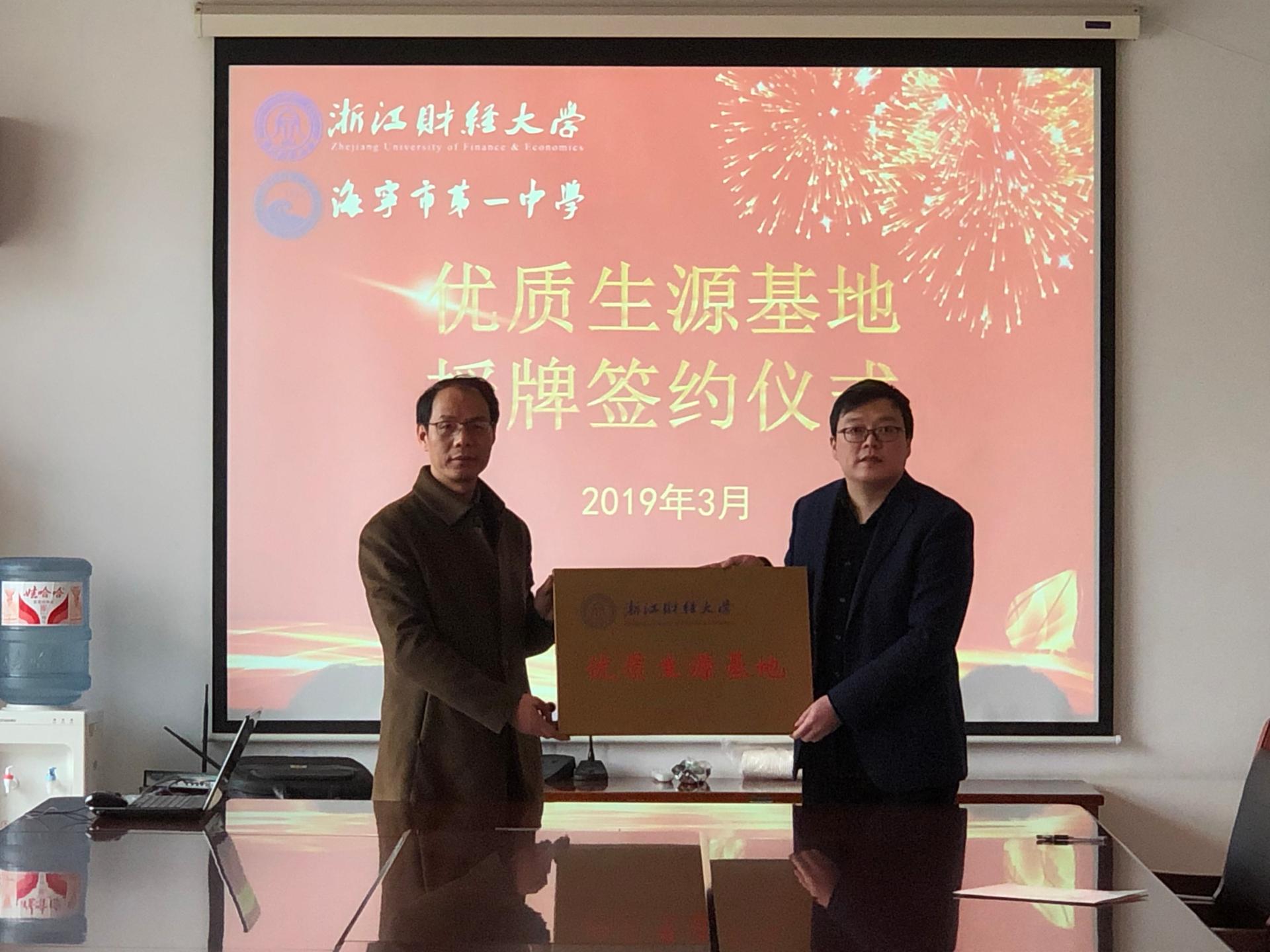 在海宁市第一中学和海宁市高级中学,两位校长分别介绍了各自中学的发展历史和基本概况及近几年的教学成果。两位校长都表示,此次挂牌将成为与浙财加强沟通联系的桥梁和纽带;海宁一中、海高中学会进一步深化教育改革,提升教学质量,努力为浙财提供更多更优秀的生源。